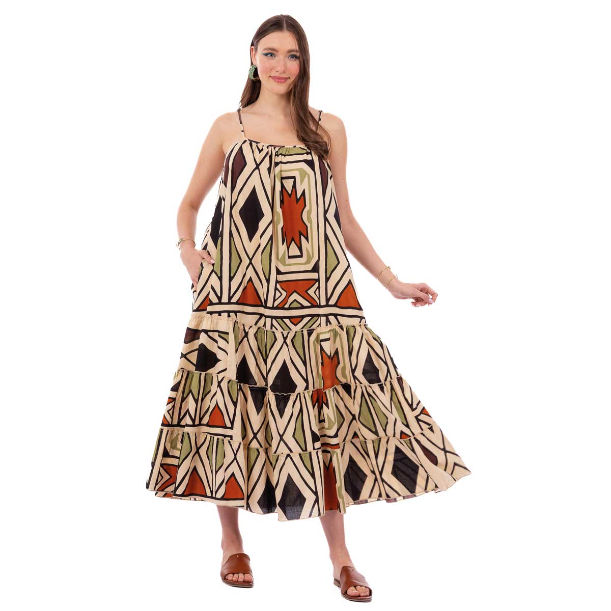 Platinum, δροσερό, φόρεμα εκρού, με πολύχρωμα boho σχέδια, γυναικείο, καλοκαιρινό, καθημερινό, σε εβαζέ με σούρα, μακρύ, τιραντέ με ρυθμιζόμενες τιράντες και ραμμένο σε 4 οριζόντια επίπεδα. Στα πλαϊνά του έχει εσωτερικές τσέπες.