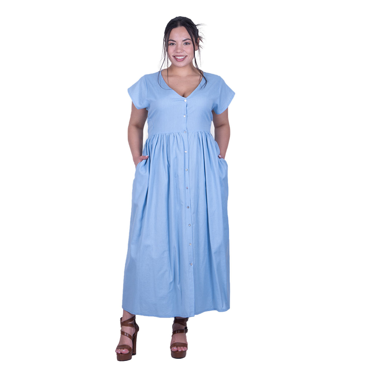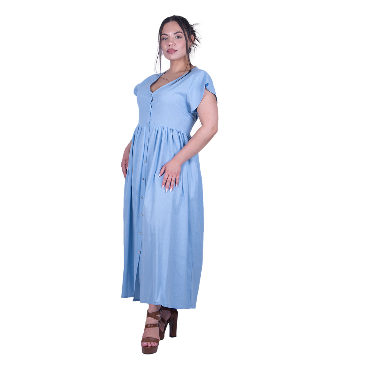 Platinum, υπέροχο, φόρεμα γαλάζιο, γυναικείο, σεμιζιέ, καλοκαιρινό, καθημερινό, μακρύ, κοντομάνικο, V ντεκολτέ και λίγη σούρα στη μέση. Κλείνει με 10 κουμπιά. Λόγω της σύνθεσής του που είναι φτιαγμένο από λινό και βαμβάκι, δε τσαλακώνει ιδιαίτερα και είναι δροσερό και ελαφρύ ρούχο! Στιλάτο, αέρινο και πανέμορφο!!!