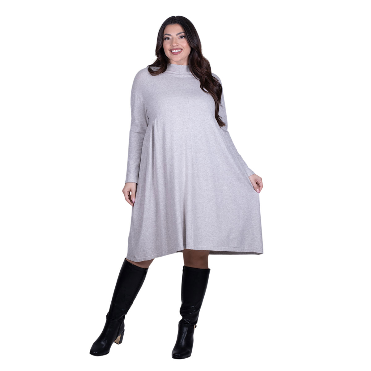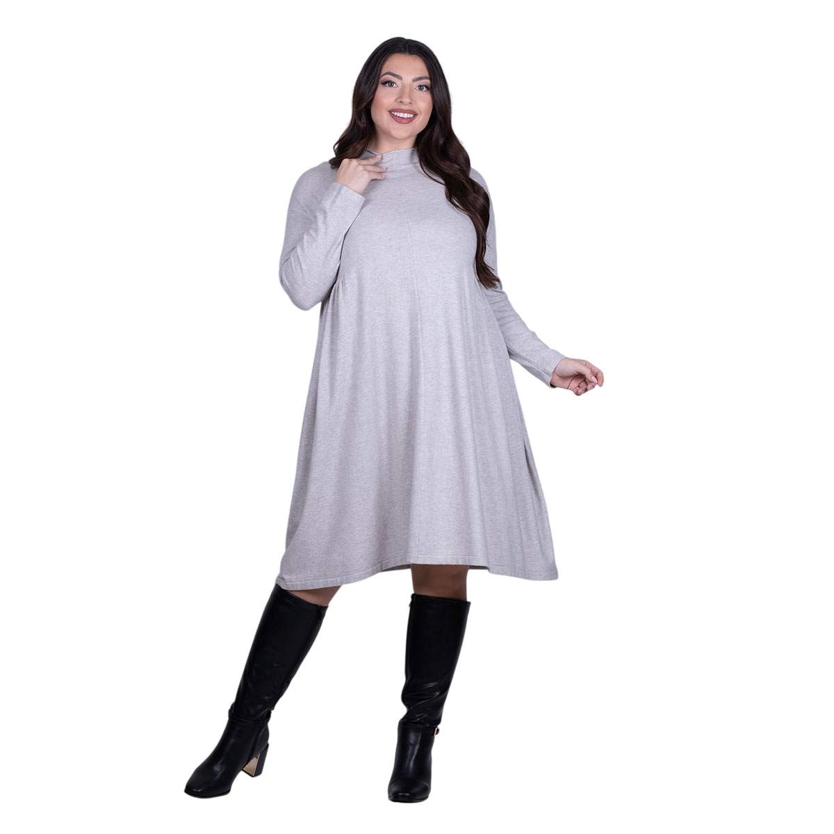Platinum, καθημερινό, φόρεμα γκρι του πάγου, γυναικείο, χειμωνιάτικο, από λεπτό πλεκτό, midi, σε φαρδιά γραμμή, τα μανίκια έχουνε χαμηλή μανικοκόλληση και λεπτή μανσέτα λάστιχο. Έχει ψηλό λαιμό και λοξό σχέδιο με λίγη σούρα κάτω από τις μασχάλες. Απλό και όμορφο φόρεμα για όλη τη διάρκεια της ημέρας.