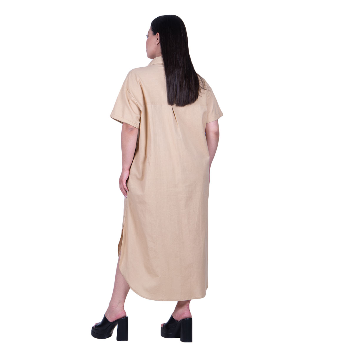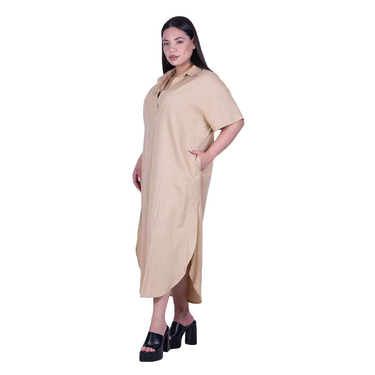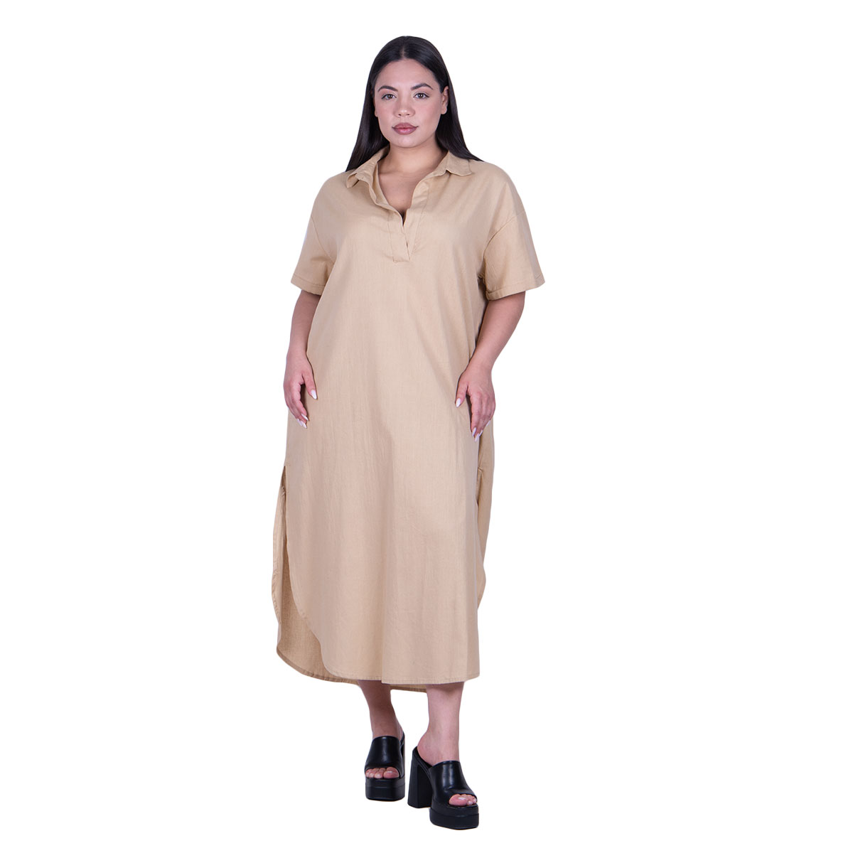 Platinum, υπέροχο, φόρεμα – καφτάνι μπεζ, γυναικείο, καλοκαιρινό, καθημερινό, midi, κοντομάνικο, V ντεκολτέ με γιακά και ανοίγματα στο πλάι. Λόγω της σύνθεσής του που είναι φτιαγμένο από λινό και βαμβάκι, δε τσαλακώνει ιδιαίτερα και είναι ελαφρύ και δροσερό ρούχο! Στιλάτο, αέρινο και πανέμορφο!!!