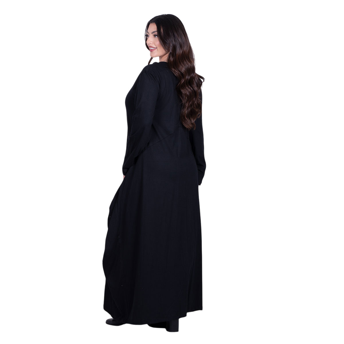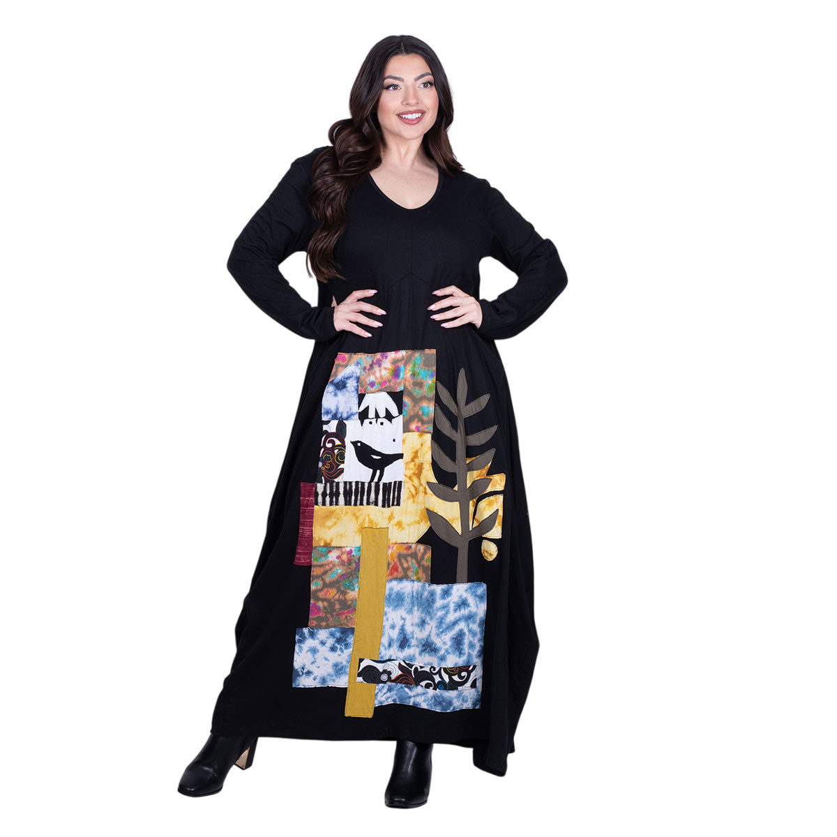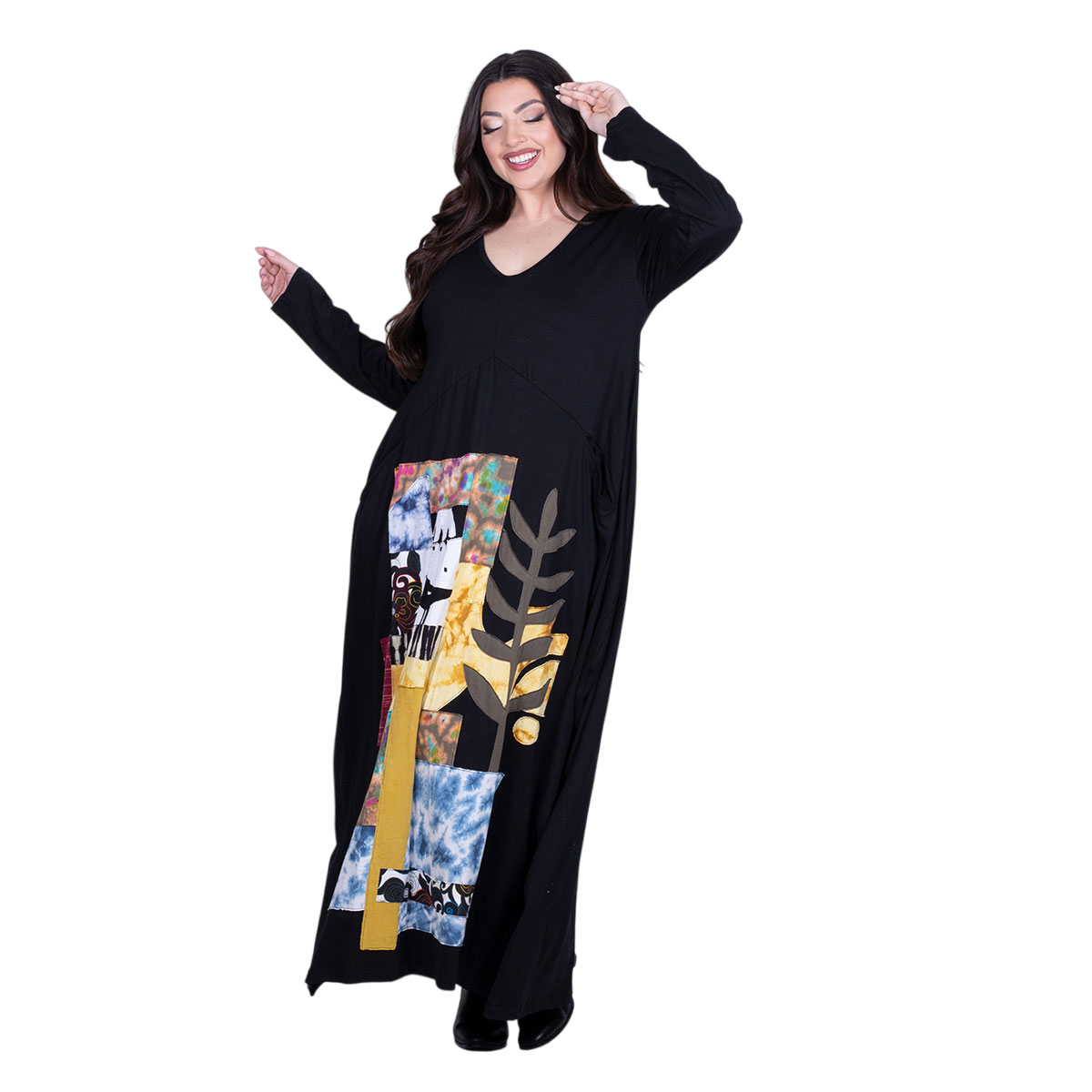 Platinum, καθημερινό, φόρεμα μαύρο, γυναικείο, χειροποίητο, maxi, μακρυμάνικο, με V λαιμόκοψη. Στο μπροστινό του μέρος έχει απλικέ πολύχρωμο υφασμάτινο σχέδιο και δύο εσωτερικές τσέπες. Πολύ εντυπωσιακό !!! Φοριέται όλη τη διάρκεια της ημέρας.