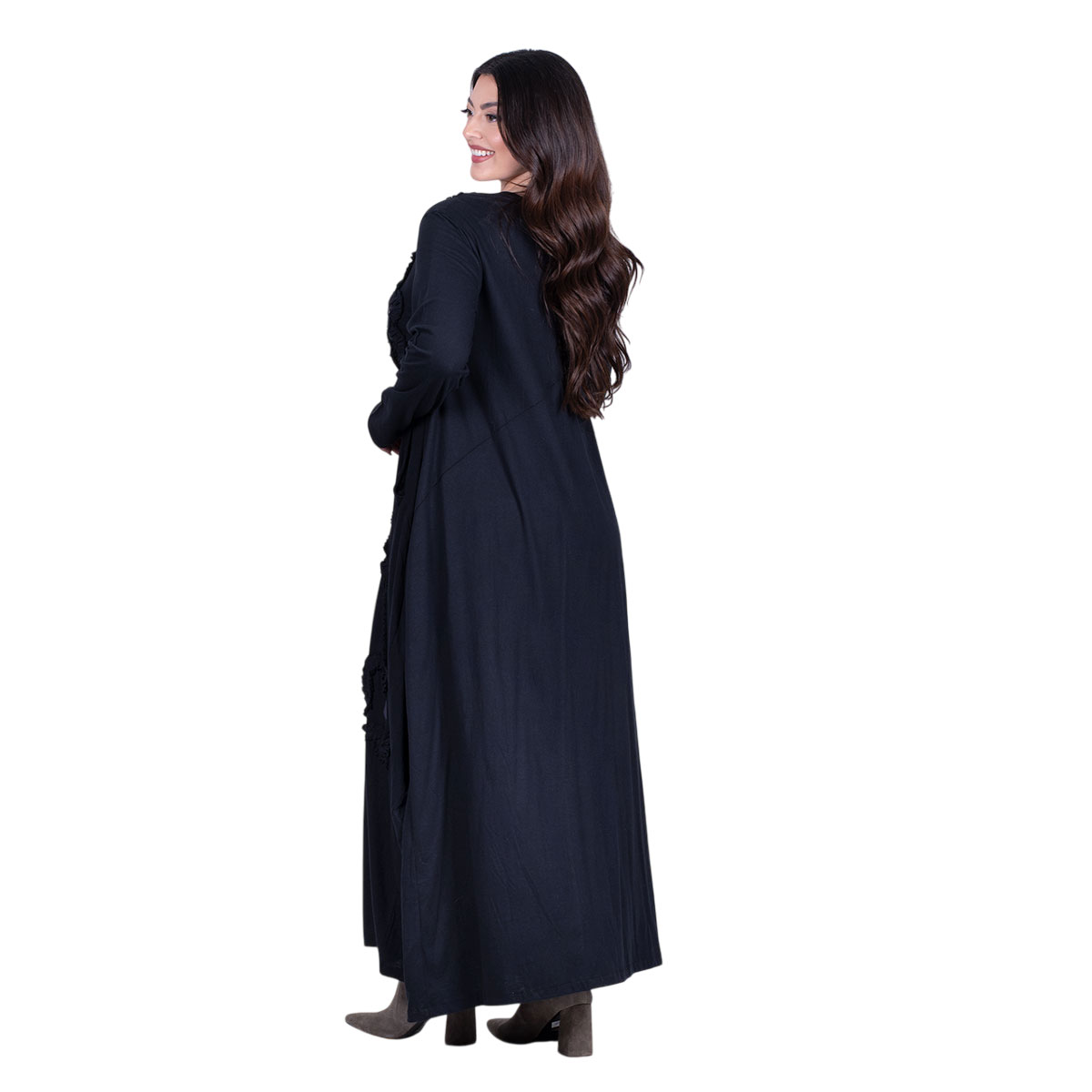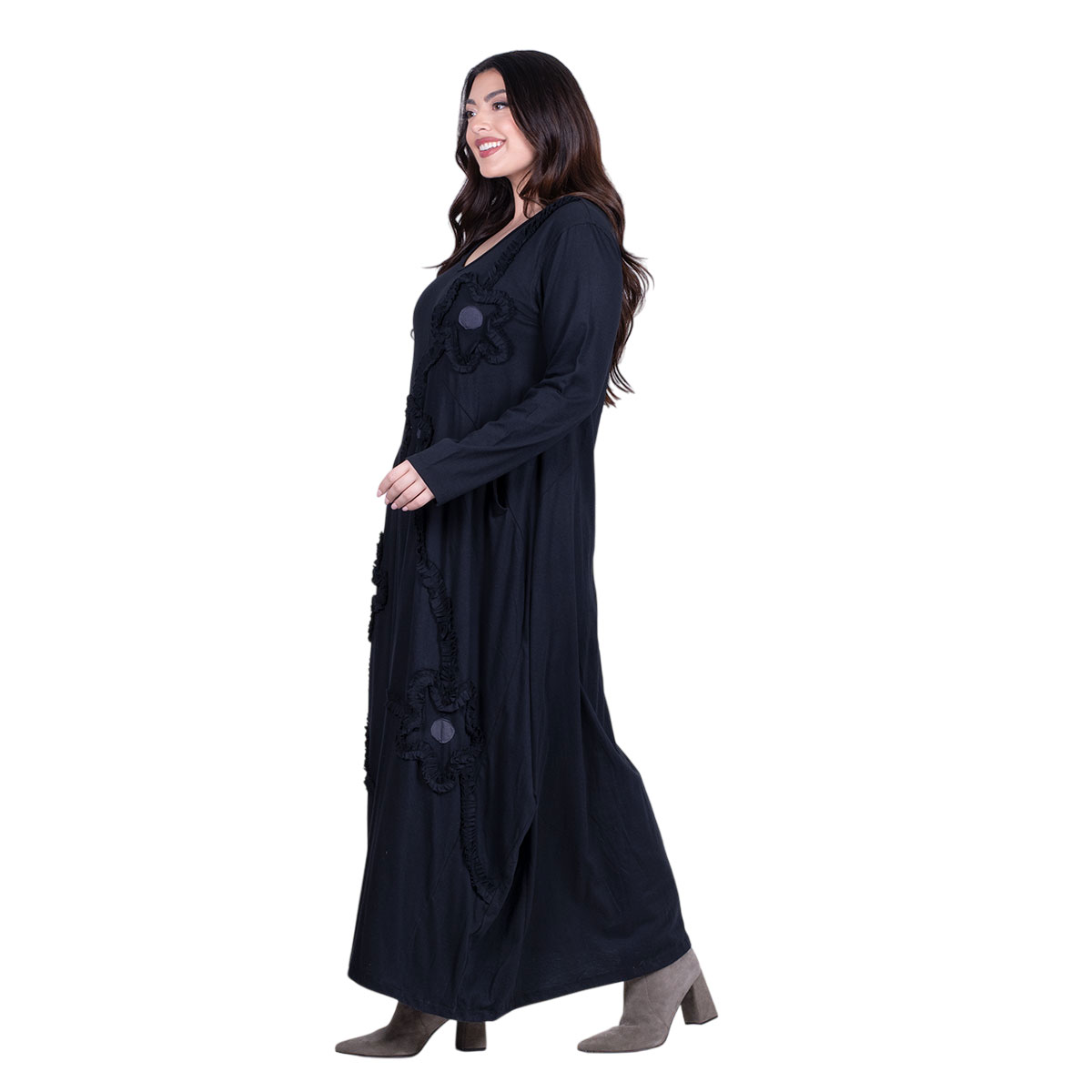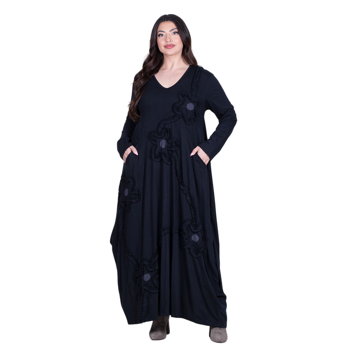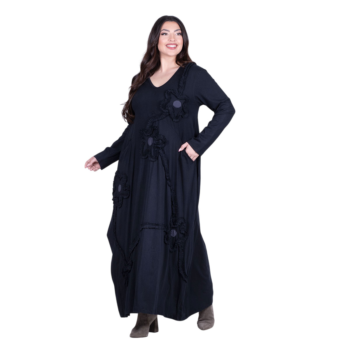 Platinum, καθημερινό, φόρεμα μαύρο, γυναικείο, χειροποίητο, maxi, μακρυμάνικο, με V λαιμόκοψη. Στο μπροστινό του μέρος έχει εξωτερικό υφασμάτινο σχέδιο με λουλούδια και δύο εσωτερικές τσέπες. Πολύ εντυπωσιακό !!! Φοριέται όλη τη διάρκεια της ημέρας.