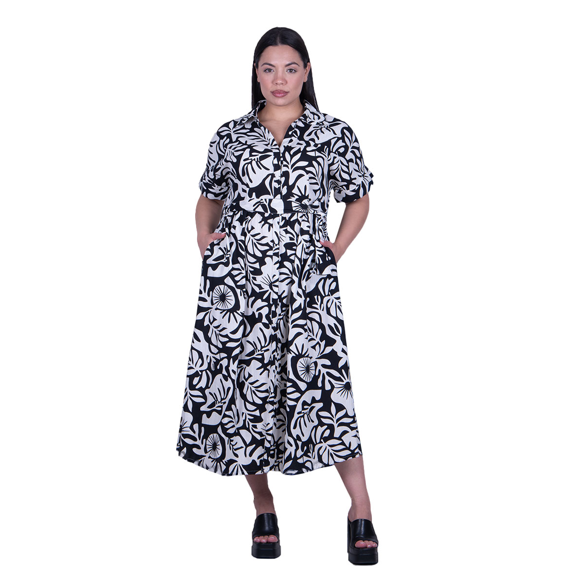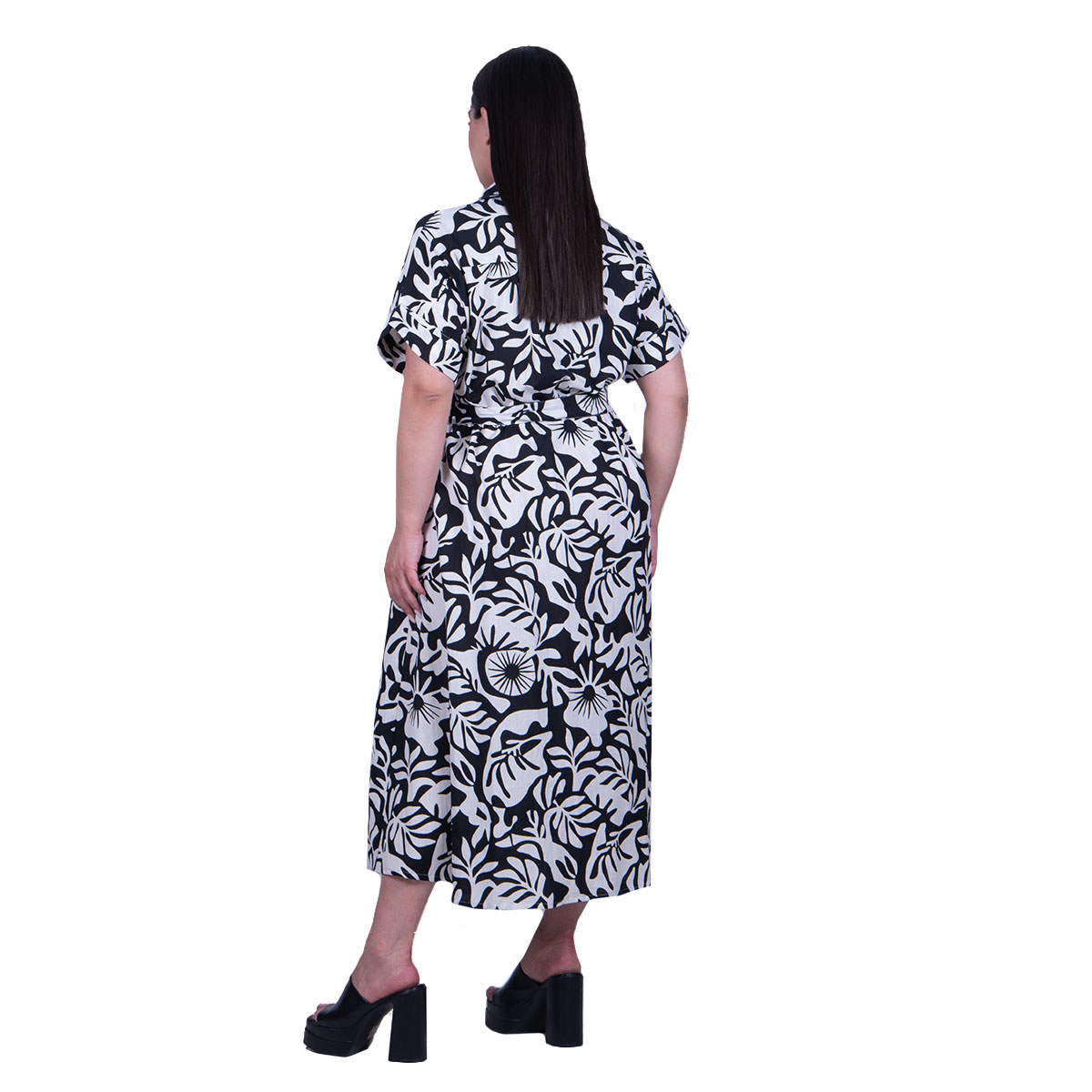 Platinum, υπέροχο, φόρεμα μαύρο με λευκά floral, γυναικείο, σεμιζιέ, καλοκαιρινό, καθημερινό, μακρύ, κοντομάνικο με μανίκια ρεγκλάν, V ντεκολτέ και λίγη σούρα στη μέση. Κλείνει με 9 κουμπιά, με πατιλέτα. Στη μέση του έχει ζώνη από το ίδιο ύφασμα. Λόγω της σύνθεσής του που είναι φτιαγμένο από λινό και βαμβάκι, δε τσαλακώνει ιδιαίτερα και είναι ελαφρύ ρούχο! Στιλάτο, αέρινο και πανέμορφο!!!
