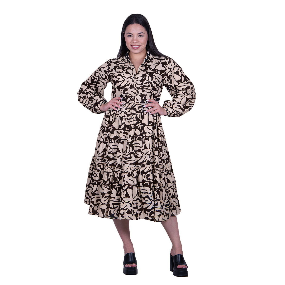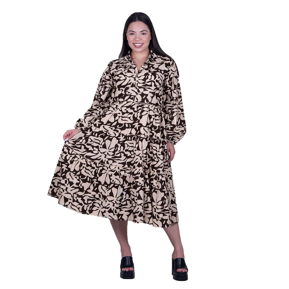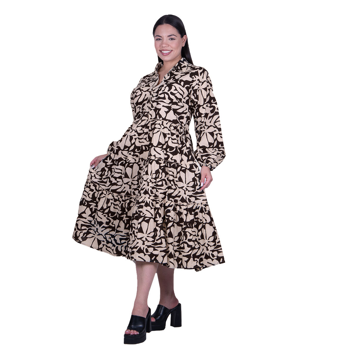 Platinum, δροσερό, φόρεμα μαύρο με εκρού, γυναικείο με γιακά, midi και μανίκια τρουκάρ με λάστιχο στο τελείωμά τους. Στο μπούστο κλείνει με 5 κουμπιά. Είναι ραμμένο σε 4 οριζόντια επίπεδα.