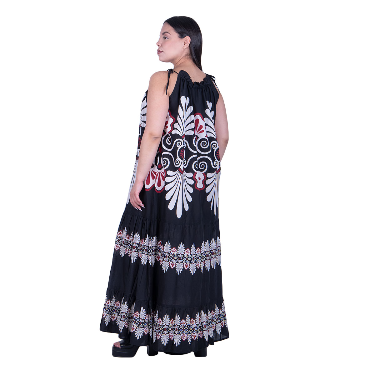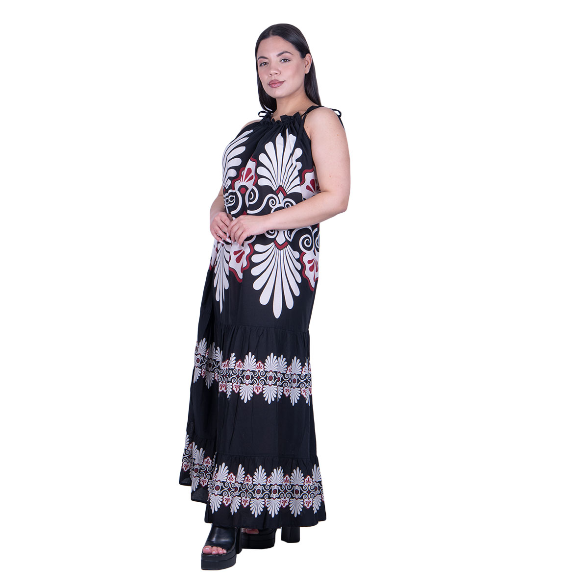Platinum, νεανικό, φόρεμα μαύρο με λευκά σχέδια, γυναικείο, καλοκαιρινό, μακρύ, αέρινο, δροσερό, εβαζέ με σούρα στο τελείωμα του, παρτούς ώμους και δέσιμο στο πλάι του λαιμού με κορδέλα από μαύρο ύφασμα.