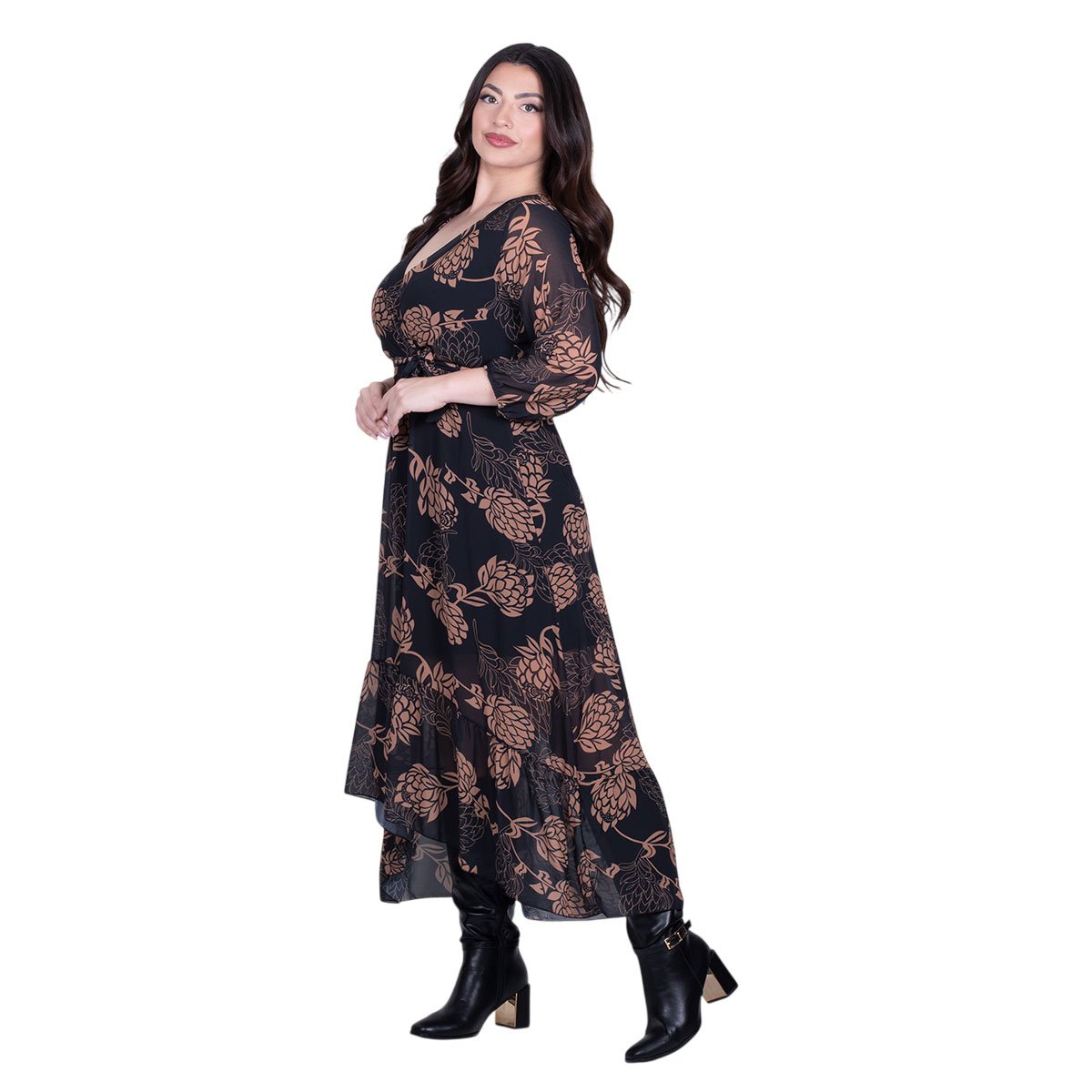 Platinum, νεανικό, μαύρο φόρεμα με μπεζ εμπριμέ, γυναικείο, ασύμμετρο, κλος, midi, κρουαζέ, καθημερινό και βολάν στο τελείωμα του. Στη μέση του έχει εσωτερικό γαζωμένο λάστιχο και ζώνη από το ίδιο ύφασμα. Εσωτερικά έχει ενσωματωμένο μαύρο μεσοφόρι. Τα μανίκια του είναι 3/4 και στο τελείωμα τους έχουνε λάστιχο. Υπέροχο ρούχο! Φοριέται όλη τη διάρκεια της ημέρας, με τα κατάλληλα αξεσουάρ και παπούτσια, φορέστε το και ως βραδινό φόρεμα!!!