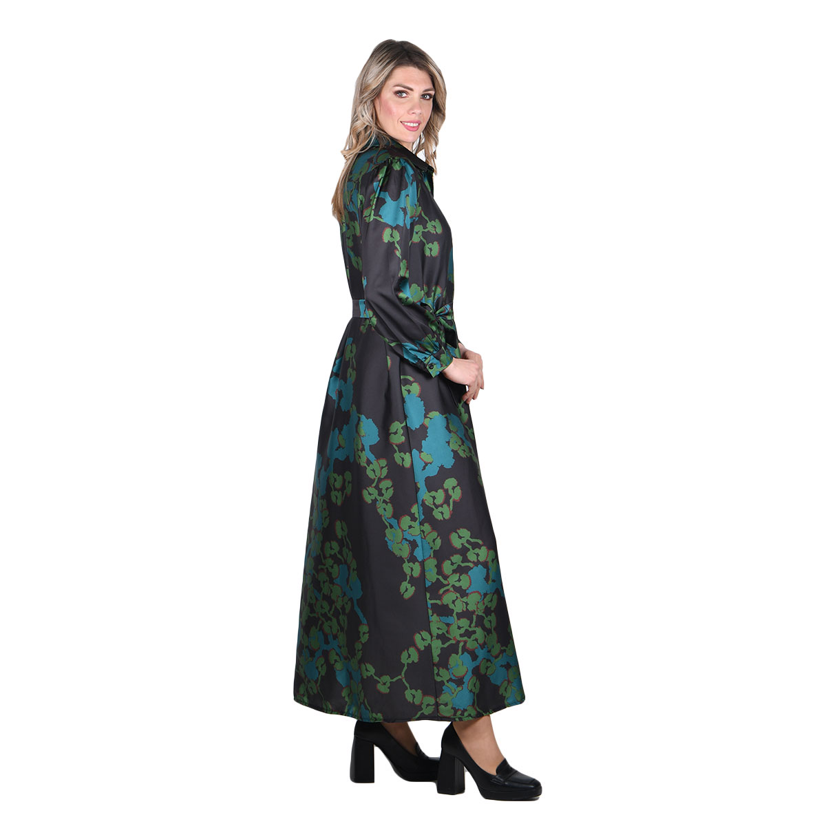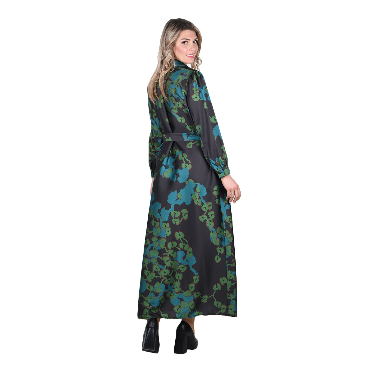 Platinum, νεανικό, φόρεμα μαύρο με πράσινα floral σε διαφορετικούς τόνους, γυναικείο, και μακριά μανίκια με μανσέτα. Κλείνει με 9 κουμπιά και έχει ζώνη από το ίδιο ύφασμα. Φορέστε το και ανοικτό ως πουκαμίσα ή ως μαντό!