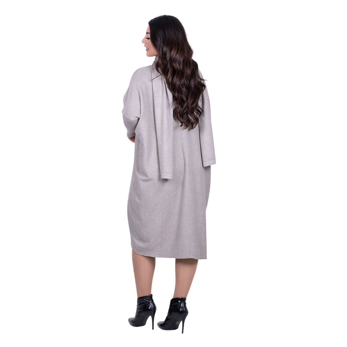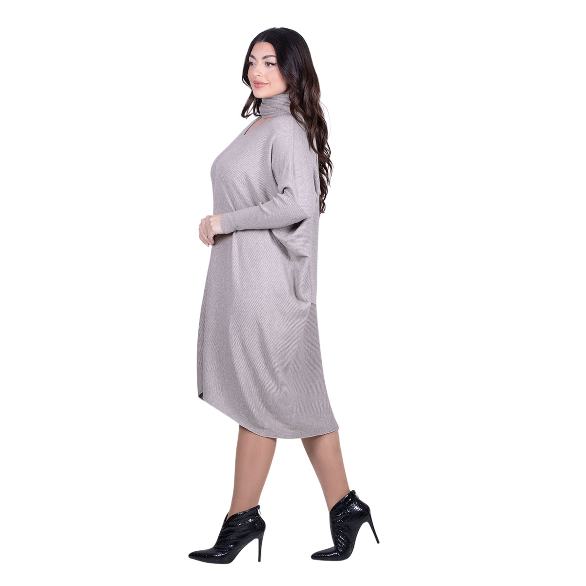 Platinum, όμορφο, φόρεμα στο χρώμα της Μόκας, γυναικείο, στυλ νυχτερίδα, με ριπ σχέδιο, midi, casual, οβάλ λαιμόκοψη, φαρδιά άνετη γραμμή και μικρή ασυμμετρία στη μπροστινή του πλευρά! Moναδικό και υπέροχο casual wear !!!