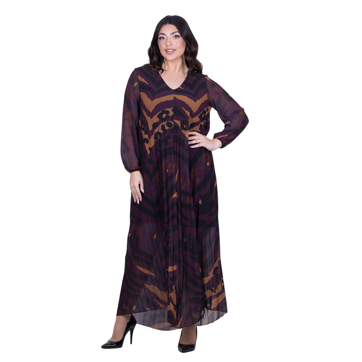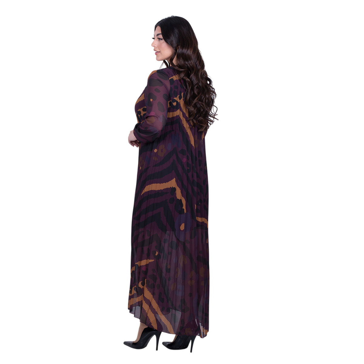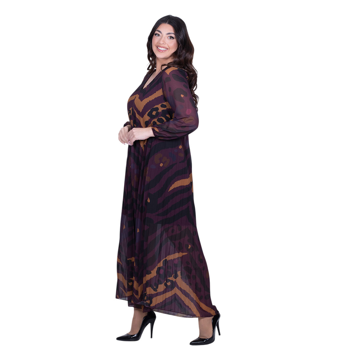 Platinum, καθημερινό, φόρεμα σε σκούρο μωβ χρώμα, με χρωματιστά animal print σχέδιο, γυναικείο, με πλισέ, μακρύ, ριχτό με V ντεκολτέ. Τα μανίκια του είναι μακριά και στο τελείωμα τους έχουνε λάστιχο. Εσωτερικά εκτός από τα μανίκια, έχει ενσωματωμένο ελαστικό ύφασμα από βισκόζι ύφασμα. Πανέμορφο!!!