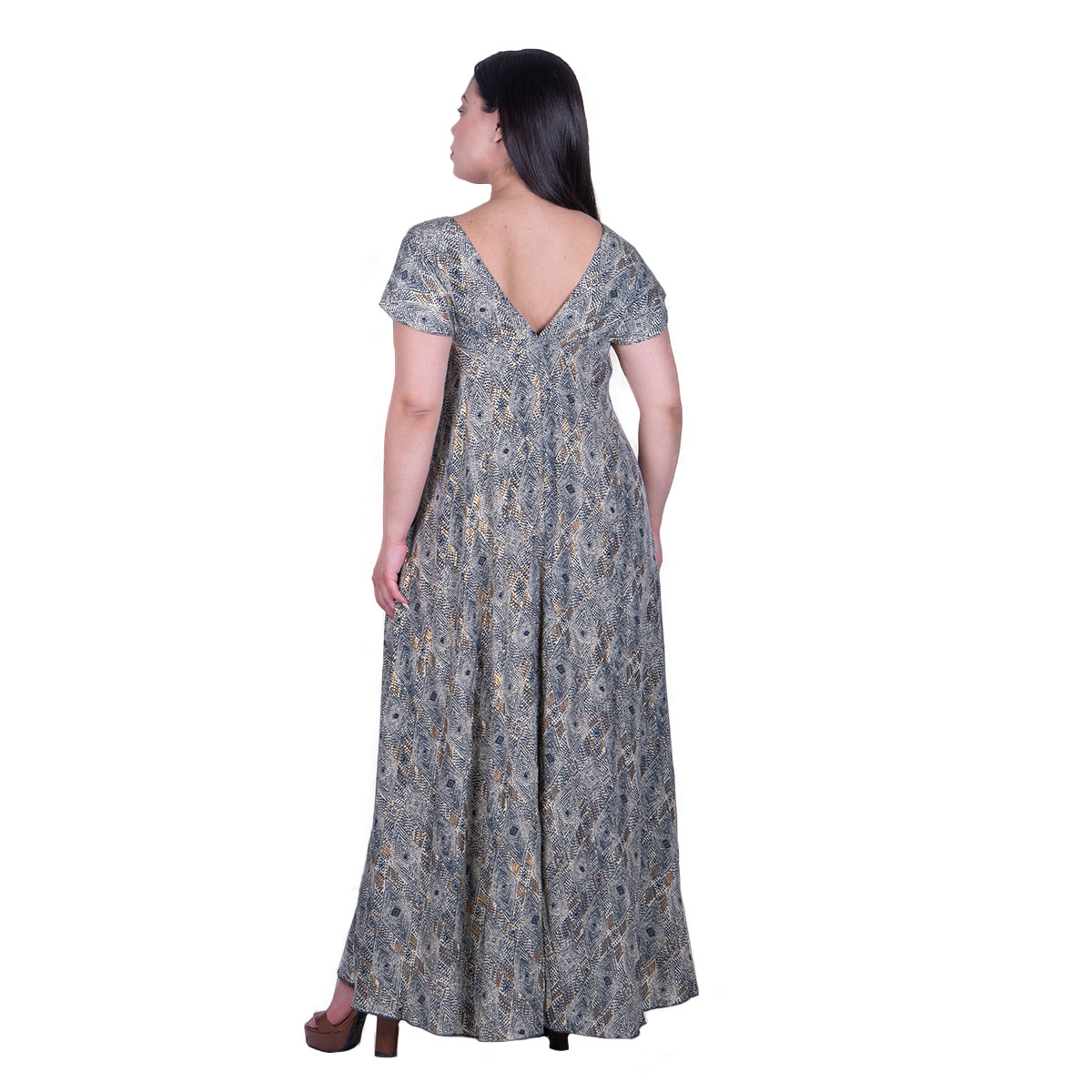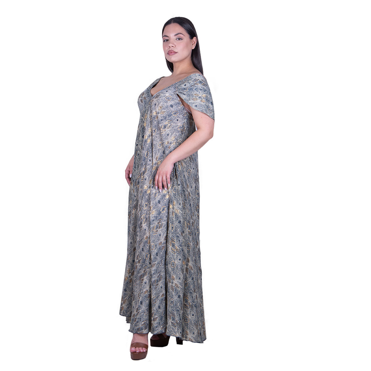 Platinum, υπέροχο, φόρεμα στο μπλε – γκρι, με πτι χρυσά σχέδια, γυναικείο, καλοκαιρινό, καθημερινό, μακρύ, ιδιαίτερο μανίκι κοντό, με V ντεκολτέ και στη πλάτη, κλος, ραμμένο σε 4 κάθετα επίπεδα και εσωτερικές τσέπες στα πλαϊνά του. Αέρινο και δροσερό!