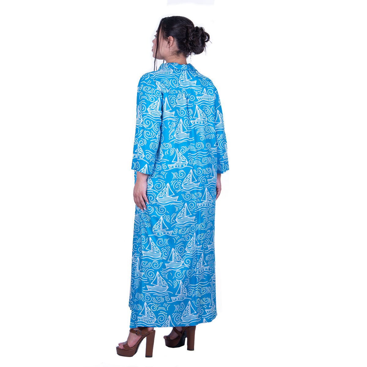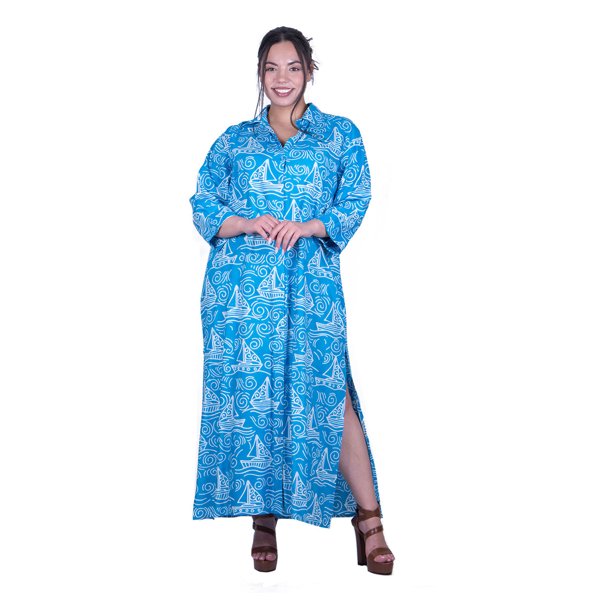 Platinum, δροσερό, φόρεμα τυρκουάζ και print με λευκά καράβια, γυναικείο, καλοκαιρινό, μακρύ, σε άνετη ίσια γραμμή και γιακά. Κλείνει με 12 κουμπιά, έχει μανίκια τρουακάρ που αναδιπλώνονται και κλείνουνε με κουμπί. Στα πλαϊνά του, έχει ανοίγματα cm. Φορέστε το και ανοικτό, με κοντή φούστα, σόρτς, βερμούδα μα και με μαγιό στη παραλία!