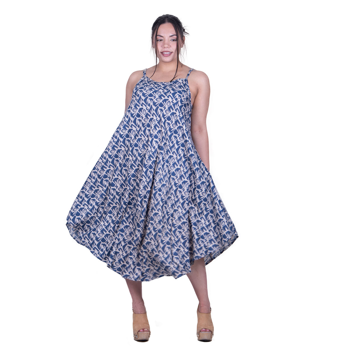 Platinum, νεανικό, φόρεμα μπλε, με μπεζ σχέδιο, καθημερινό, γυναικείο, midi, τιραντέ . Είναι στυλ umprella, στρογγυλή λαιμόκοψη και αυξομειωμένη τιράντα. Ιδανικό και για καφτάνι παραλίας. Αέρινο και δροσερό!