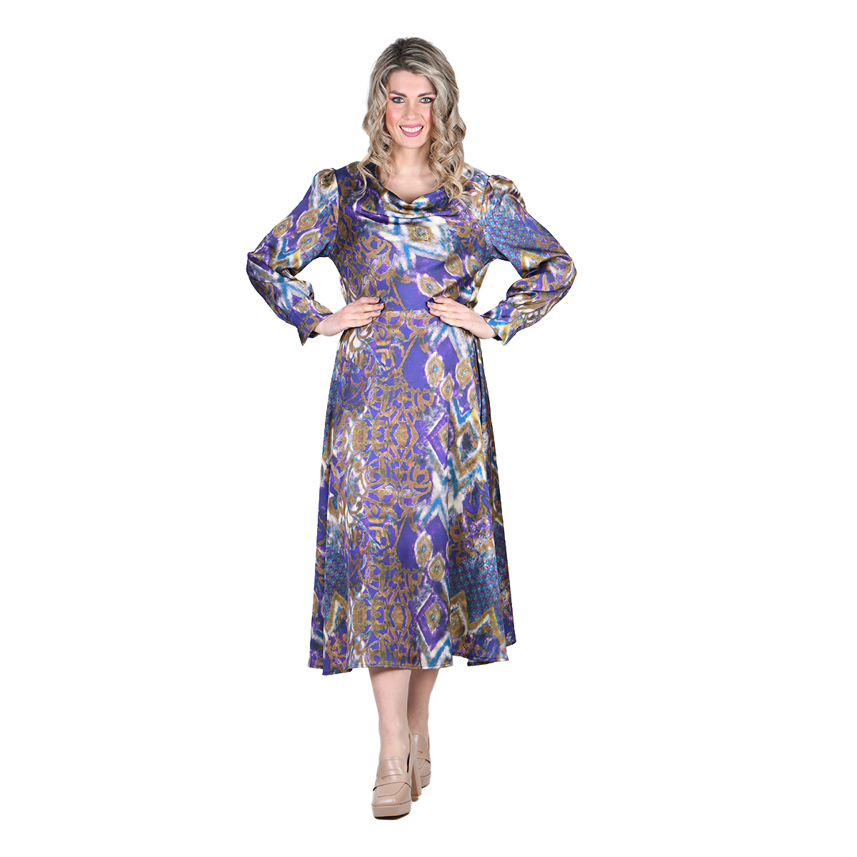 Platinum, νεανικό, φόρεμα μπλε ρουά σκούρο, με εμπριμέ γήινα σχέδια, γυναικείο, μακρύ, μεσάτο, με γιακά ντραπέ και ελαφρύ κλος στο τελείωμα του. Στη μέση έχει εσωτερικό γαζωμένο λάστιχο και πλαϊνά της θυλάκια για ζώνη. Στα μανίκια του έχει μανσέτες με κουμπί και στη πλάτη έχει μικρό άνοιγμα 14 cm, που κλείνει με μπλε ρουά κουμπί.
