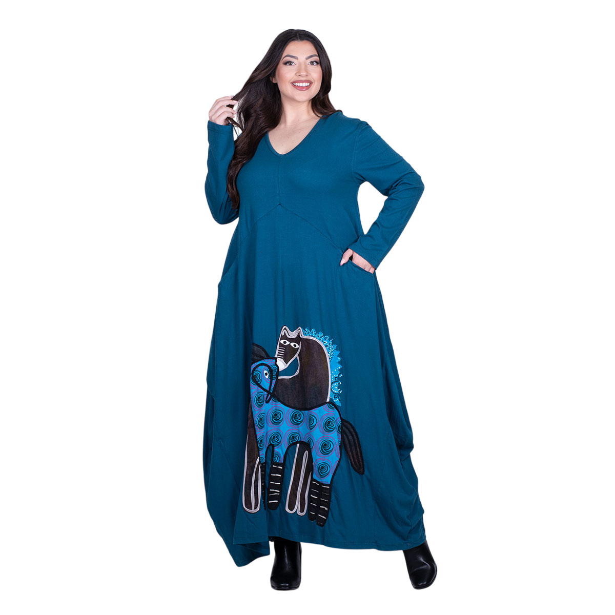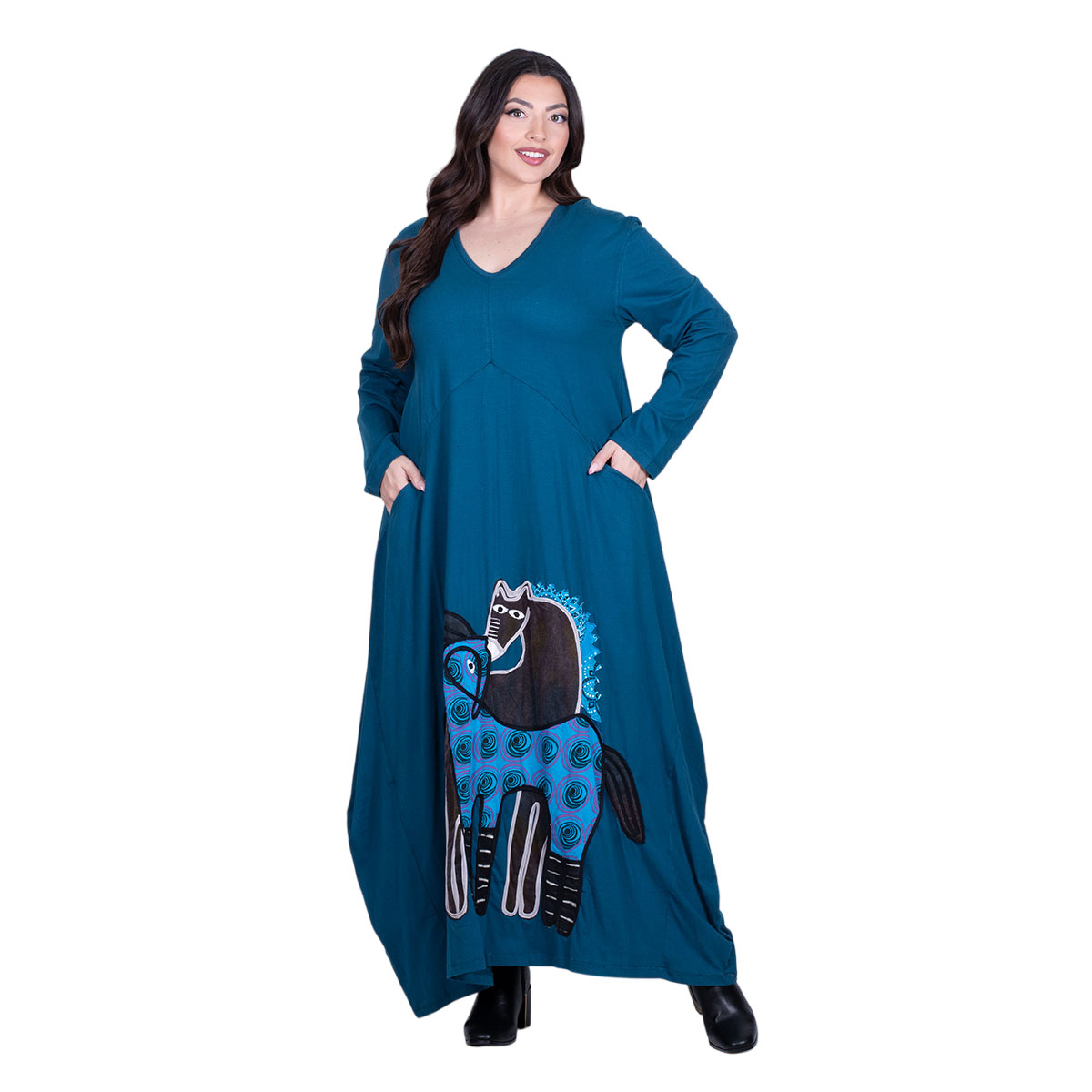 Platinum Φόρεμα Πετρόλ Γυναικείο Απλικέ Maxi ”Ερωτευμένα Άλογα Patchwork” All Day – PL-233-KD