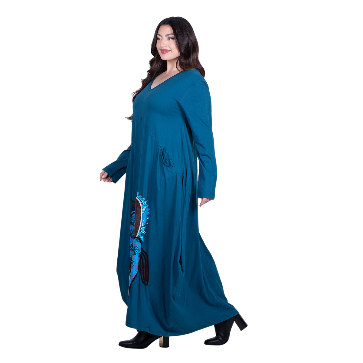 Platinum, καθημερινό, φόρεμα πετρολ, γυναικείο, χειροποίητο, maxi, μακρυμάνικο, με V λαιμόκοψη. Στο μπροστινό του μέρος έχει απλικέ πολύχρωμο υφασμάτινο σχέδιο και δύο εσωτερικές τσέπες. Πολύ εντυπωσιακό !!! Φοριέται όλη τη διάρκεια της ημέρας.