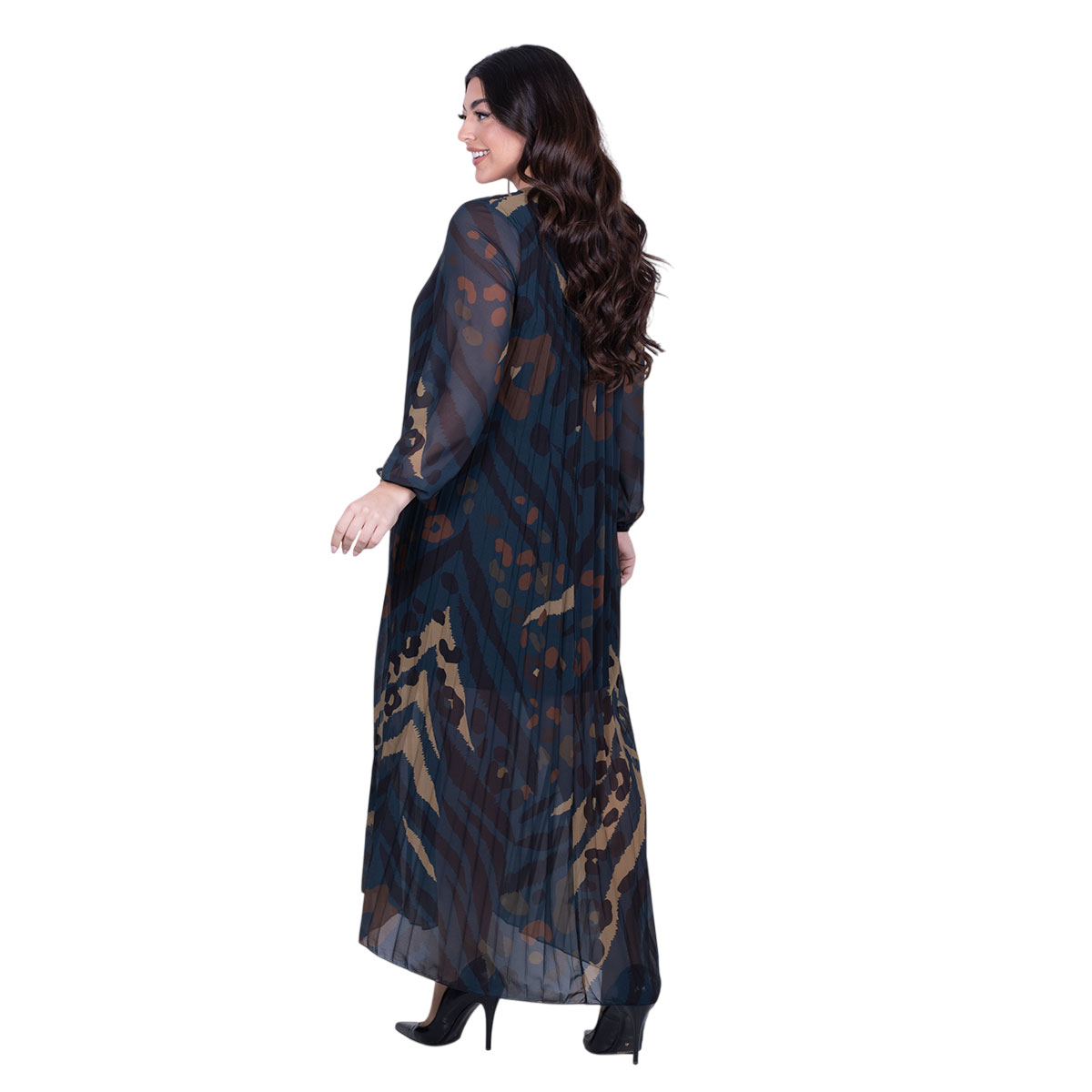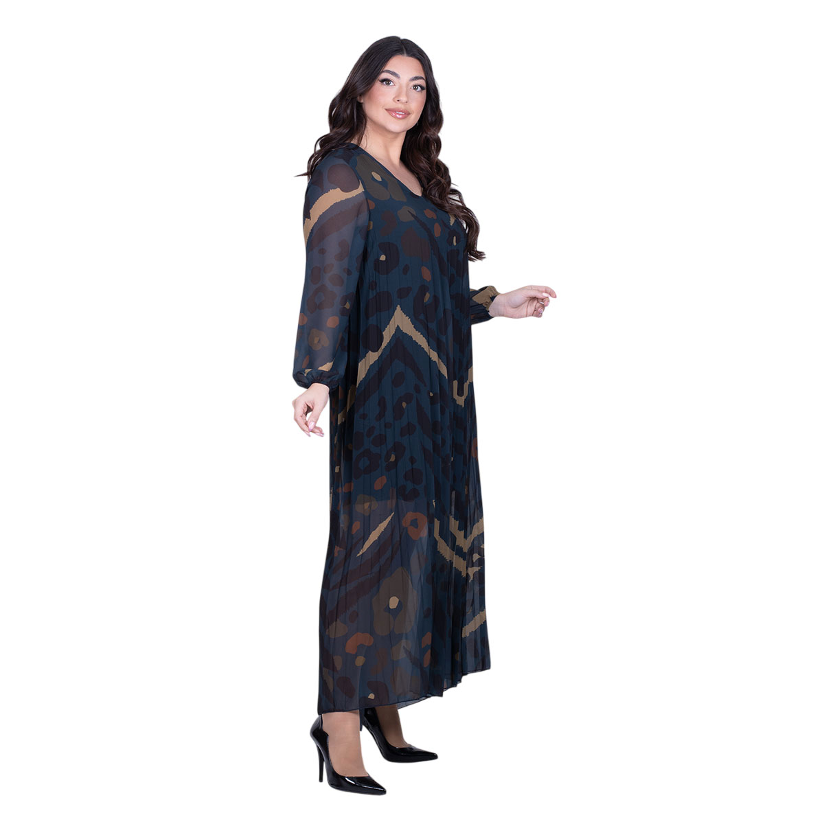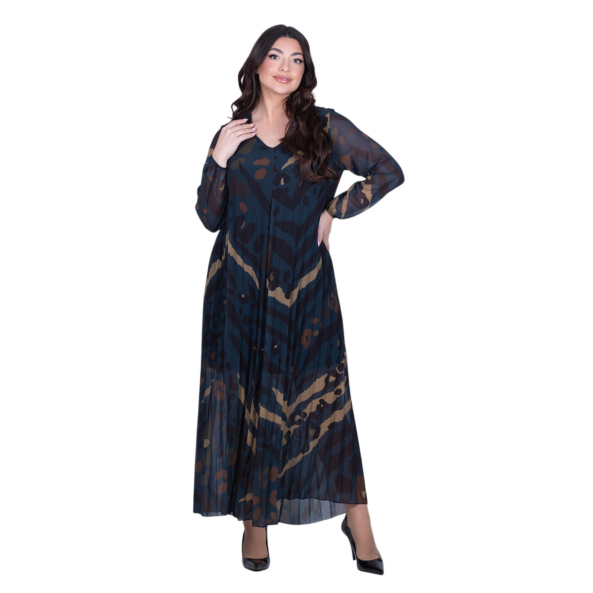 Platinum, καθημερινό, φόρεμα πετρολ, με animal print σχέδιο, γυναικείο, με πλισέ, μακρύ, ριχτό με V ντεκολτέ. Τα μανίκια του είναι μακριά και στο τελείωμα τους έχουνε λάστιχο. Εσωτερικά εκτός από τα μανίκια, έχει ενσωματωμένο ελαστικό ύφασμα από βισκόζι ύφασμα. Πανέμορφο!!!
