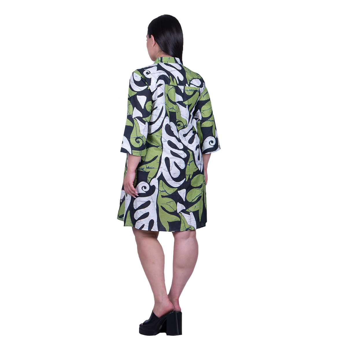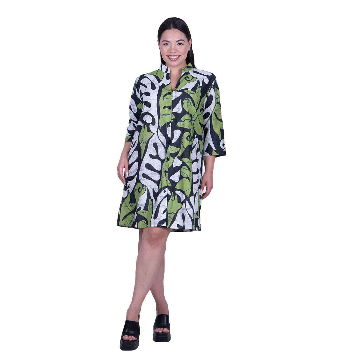 Platinum, υπέροχο, φόρεμα πράσινο, με μαύρα και λευκά σχέδια, γυναικείο, καλοκαιρινό, καθημερινό, midi, με αναδιπλωμένα τρουακάρ μανίκια. Έχει γιακά στυλ Μάο, μικρό V ντεκολτέ και κλείνει με 7 κουμπιά. Αέρινο και δροσερό!
