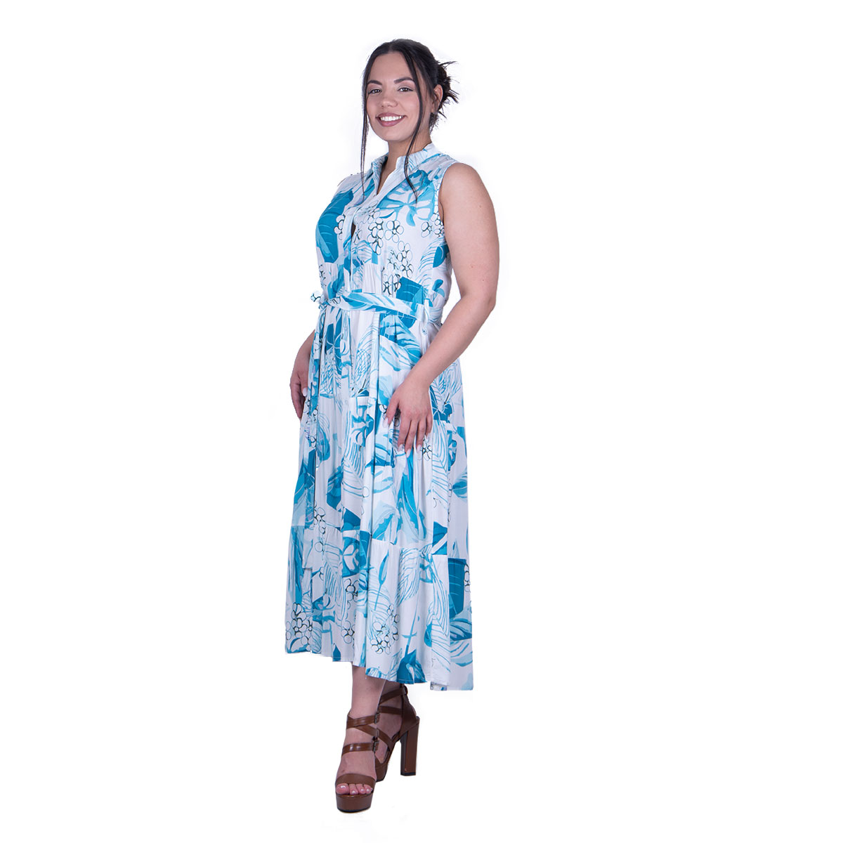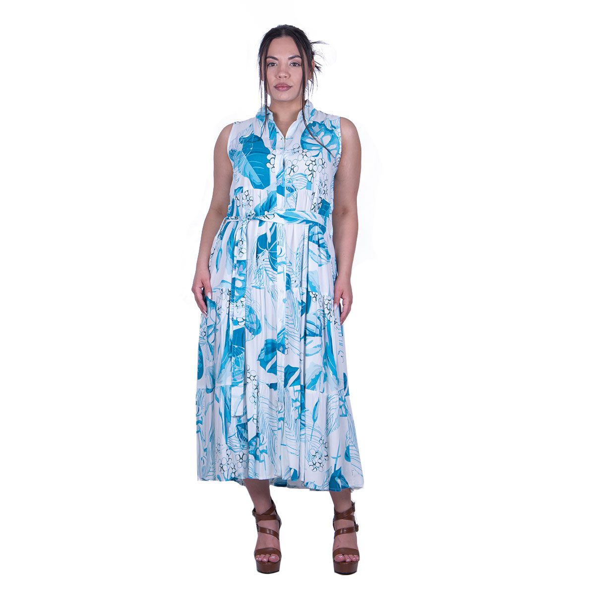 Platinum, νεανικό, φόρεμα άσπρο με γαλάζια floral γυναικείο, καλοκαιρινό, καθημερινό, μακρύ, αμάνικο, klos, που κλείνει με 12 κουμπιά και γιακά. Έχει ζωνάκι από το ίδιο ύφασμα. Στιλάτο, αέρινο και πανέμορφο!!!