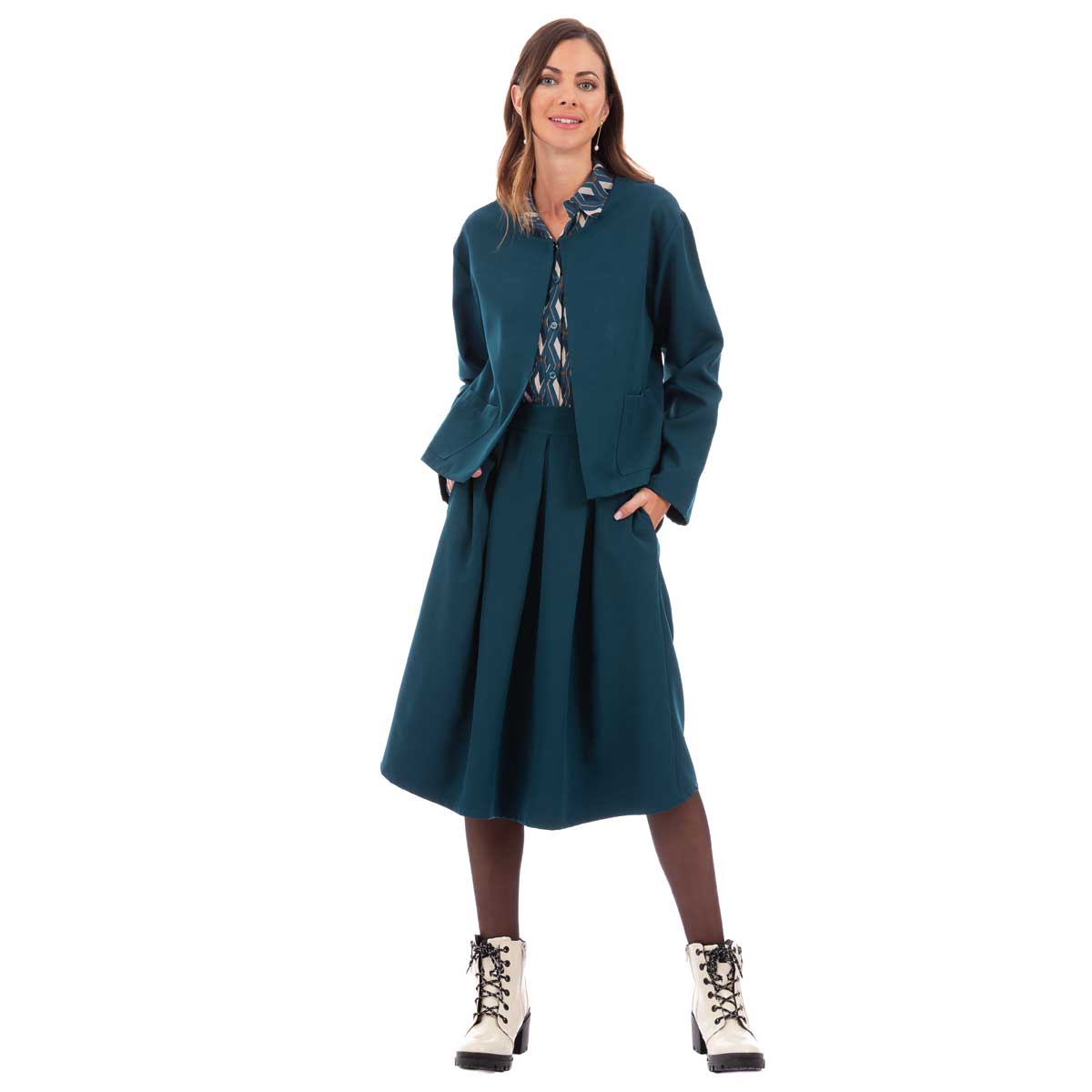 Platinum, υπέροχη, φούστα πετρολ, γυναικεία, εβαζέ με φαρδιές πιέτες . Στη μέση της μόνο στο πίσω μέρος, έχει χοντρό μαύρο λάστιχο. Στα πλαϊνά της έχει εσωτερικές τσέπες. Απλή, κομψή και ιδιαίτερη!