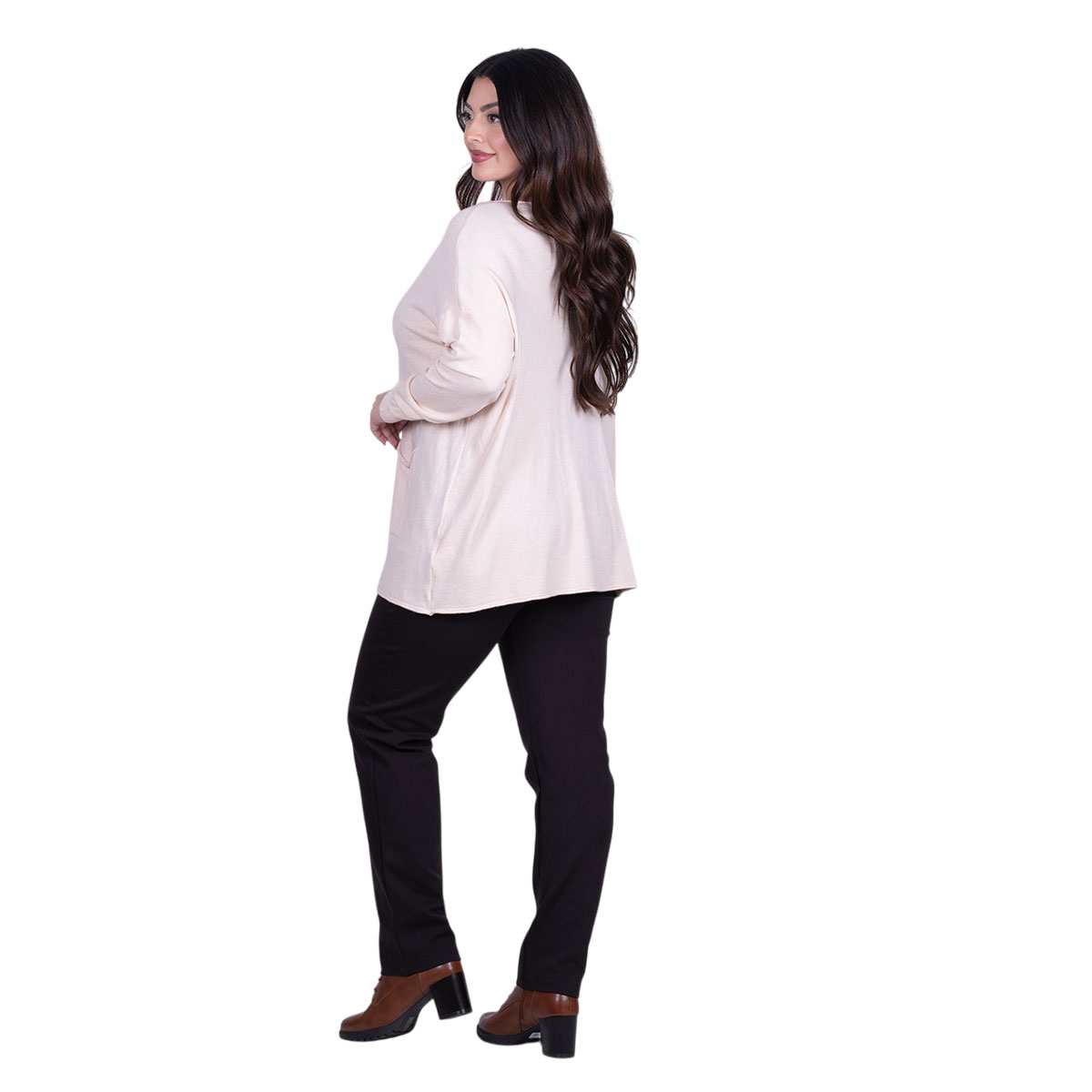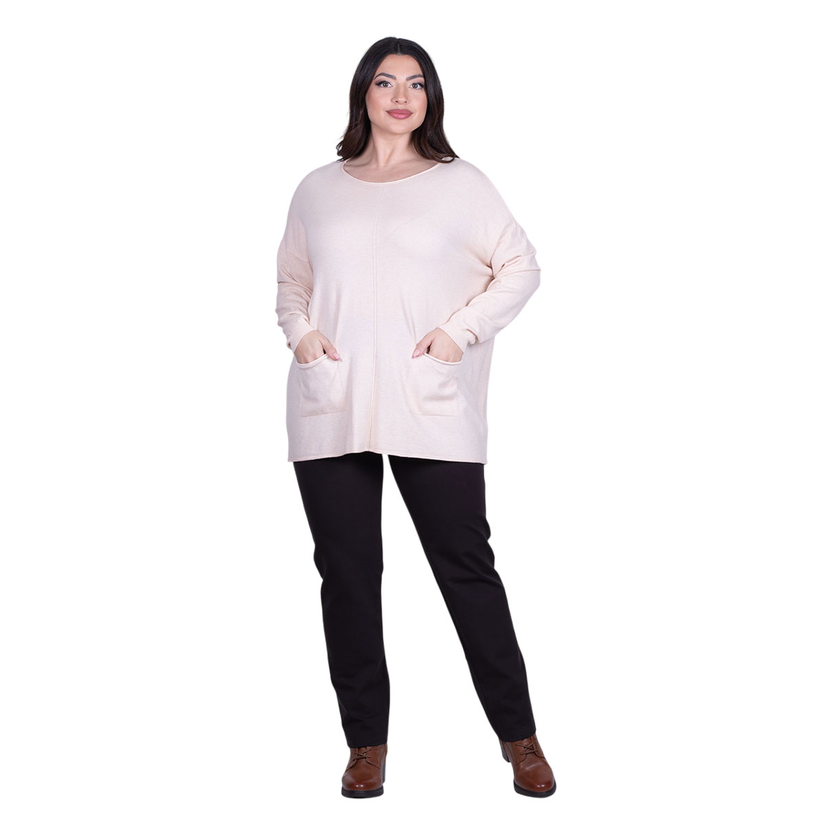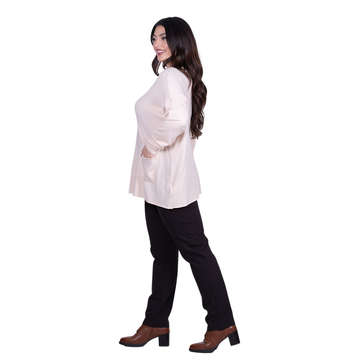 Platinum, καθημερινή, ροζ nude μπλούζαγυναικεία, φαρδιά, λεπτή, πλεκτή, με στρογγυλή λαιμόκοψη, με δύο μπροστινές τσέπες, μακριά μανίκια με χαμηλή μανικοκόλληση και rib άκρες.