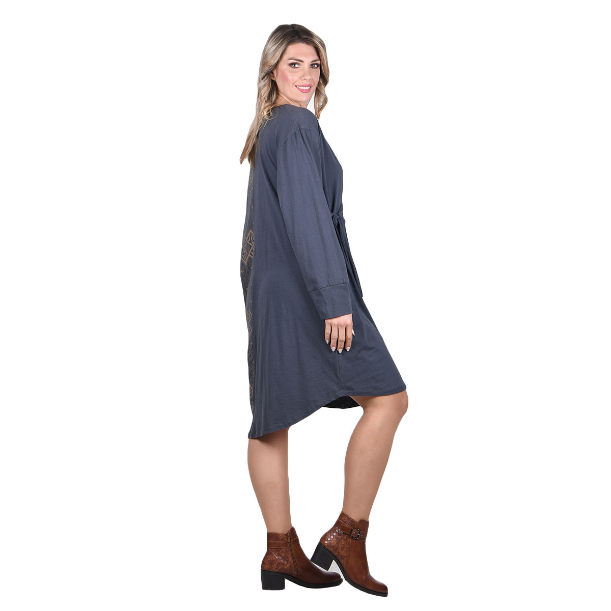 Platinum, νεανικό, γυναικείο, καθημερινό, κοντό, γκρι φόρεμα free size, σε ίσια άνετη γραμμή, με σχέδιο από εκρού γεωμετρικά print. Στη δεξιά του πλευρά, δένει με υφασμάτινη ζώνη. Στο τελείωμά του, κάνει μια μικρή ασυμμετρία 5 cm..