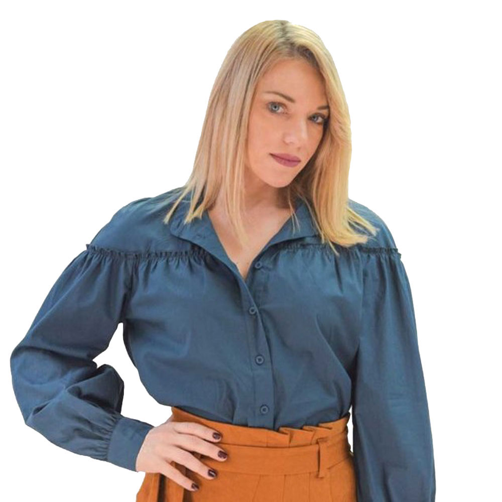 Platinum, νεανικό, γυναικείο, καθημερινό, μακρυμάνικo, πετρόλ πουκάμισο, με γιακά στύλ Μάο. Κλείνει με 7 κουμπιά και στα μανίκια του έχει σούρα, όπως και στο μπούστο του, σα μικρό βολάν. Το μανίκι του είναι ρεγκλάν. Πρωτότυπο σχέδιο!