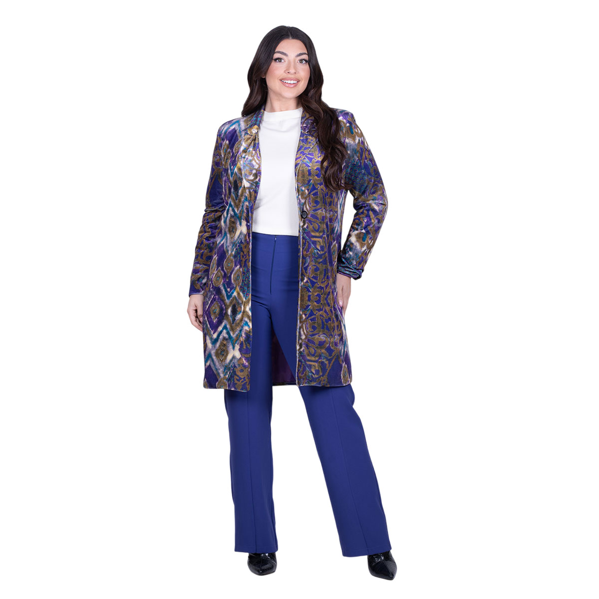 Platinum, υπέροχο, ημίπαλτο μωβ, με γήινα πολύχρωμα σχέδια, γυναικείο, νεανικό, casual, σε άνετη γραμμή, με φόδρα. Κλείνει με κουμπί.