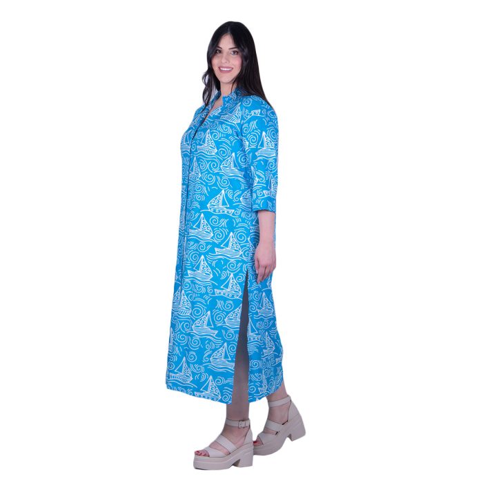 Platinum Φόρεμα Μπλε Με Λευκά Print Γυναικείο Μακρύ Με Κουμπιά Και Γιακά Free Size – 22565-56