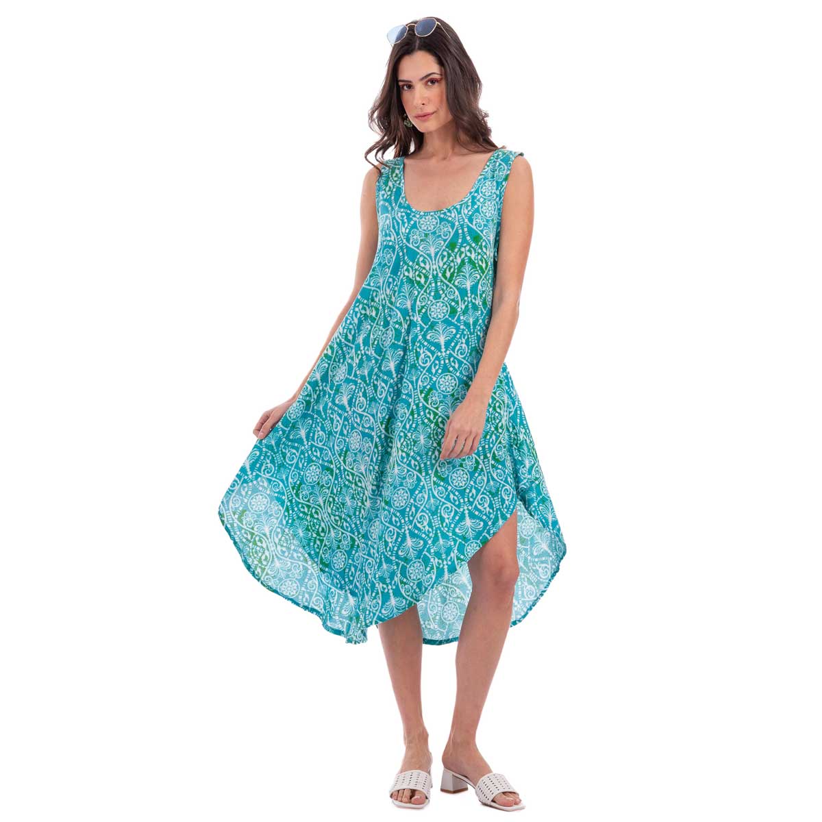 Platinum, νεανικό, φόρεμα – καφτάνι, aqua με λευκά floral print, γυναικείο, αέρινο, αμάνικο, δροσερό στυλ umprella, με οβαλ λαιμόκοψη.