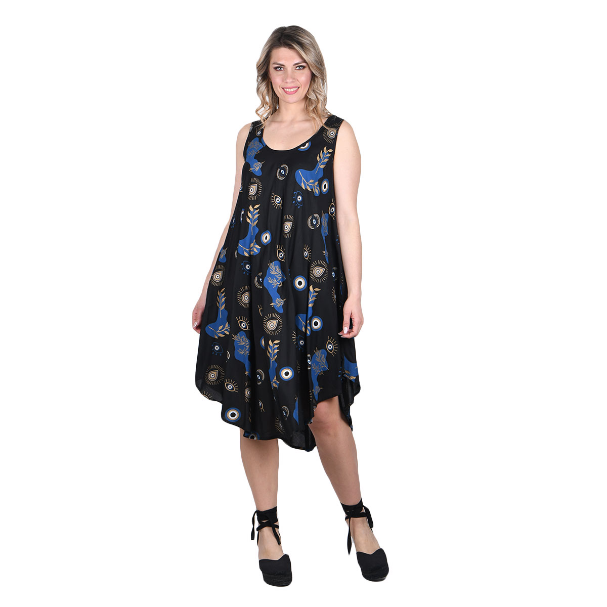 Platinum, νεανικό, καφτάνι – φόρεμα, μαύρο, γυναικείο, με διακριτικά αρχαιοελληνικά χρυσά και μπλε αρχαιοελληνικά σχέδια, χοντρή τιράντα, κοντό, στυλ umprella, με στρογγυλή λαιμόκοψη, καθημερινό και με μικρή ασυμμετρία στο τελείωμά του. Φοριέται όλη τη διάρκεια της ημέρας. Ιδανικό και για βοηθητικό φόρεμα. Αέρινο και δροσερό!