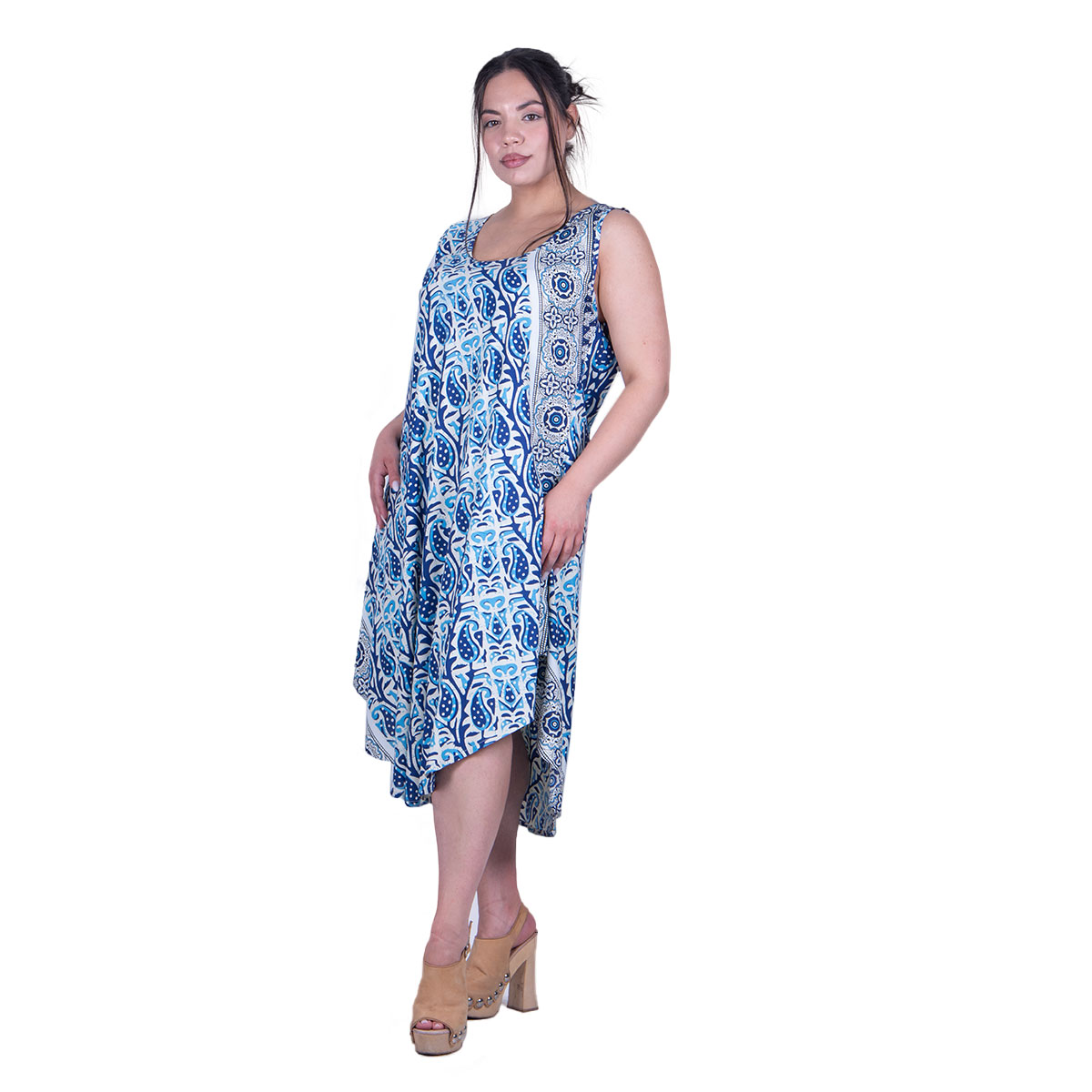 Platinum, νεανικό, φόρεμα – καφτάνι μπλε με γαλάζια boho print, γυναικείο, αέρινο, αμάνικο, δροσερό, στυλ umprella, με οβάλ λαιμόκοψη.
