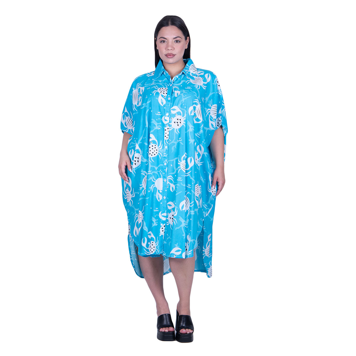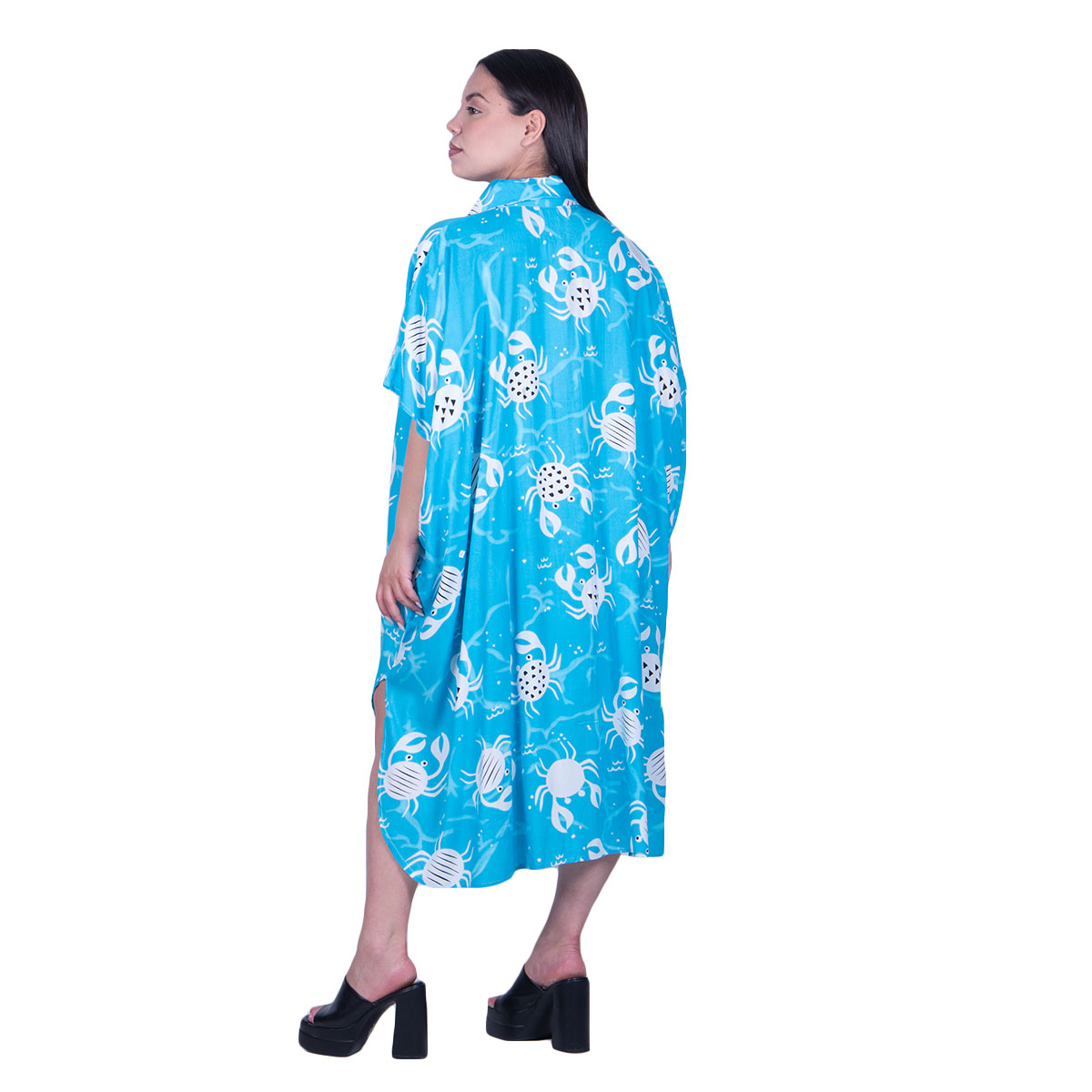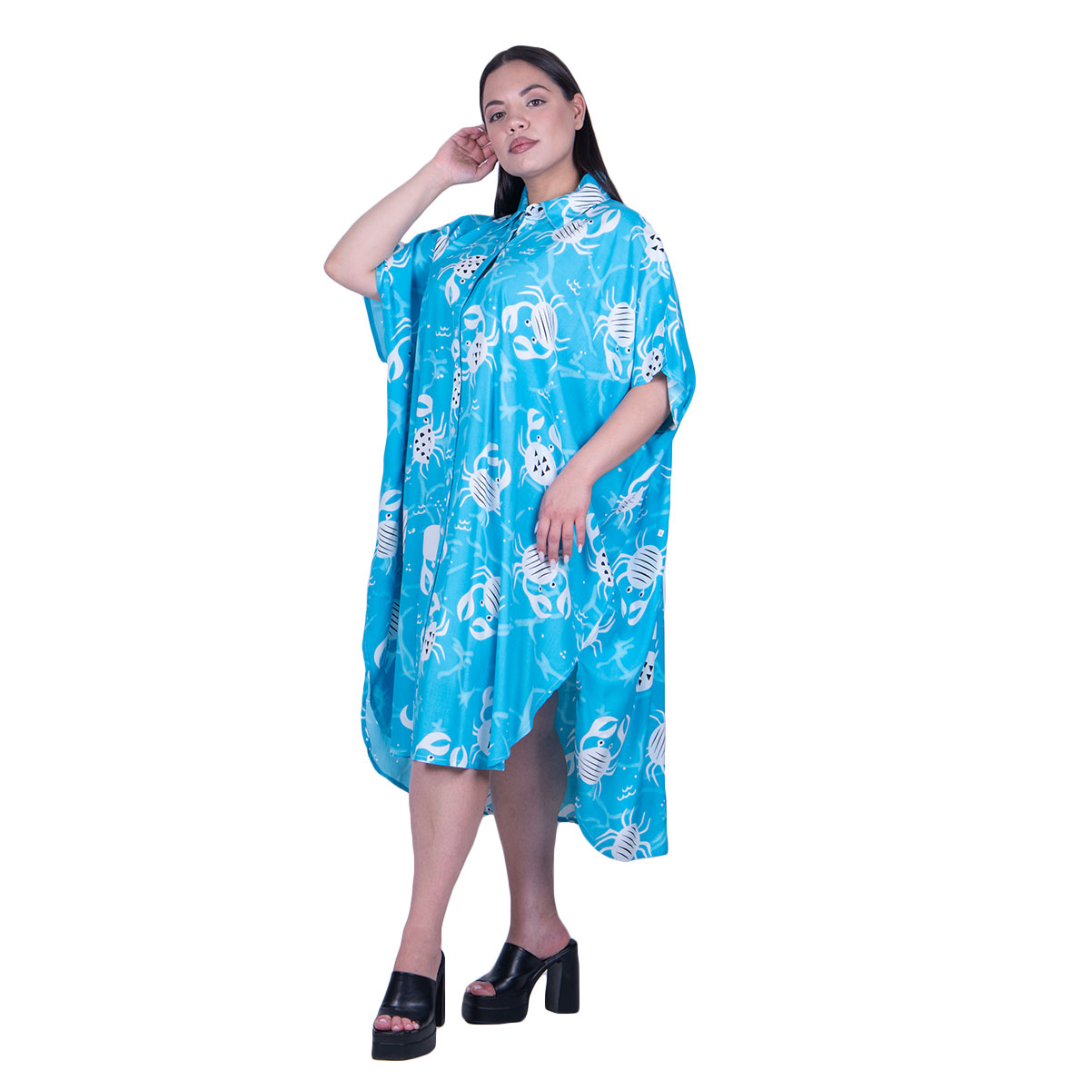 Platinum, νεανικό, καφτάνι – φόρεμα – πουκαμίσα, τυρκουάζ με θαλασσινά σχέδια, γυναικείο, midi, με γιακά, μικρή ασυμμετρία και κλείνει με 10 κουμπιά. Στα τελείωμα του στα πλαϊνά, έχει ανοίγματα. Κολακεύει όλα γυναικεία σώματα!