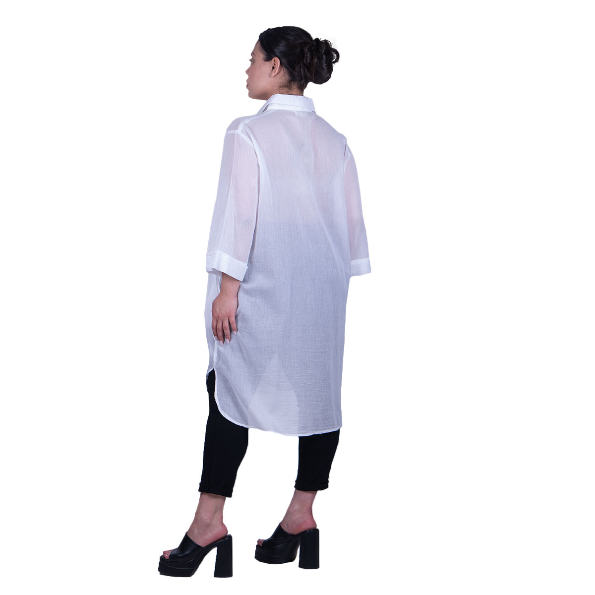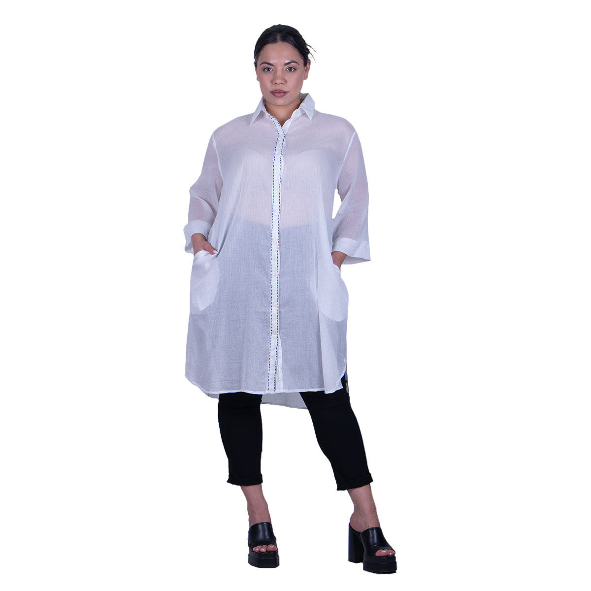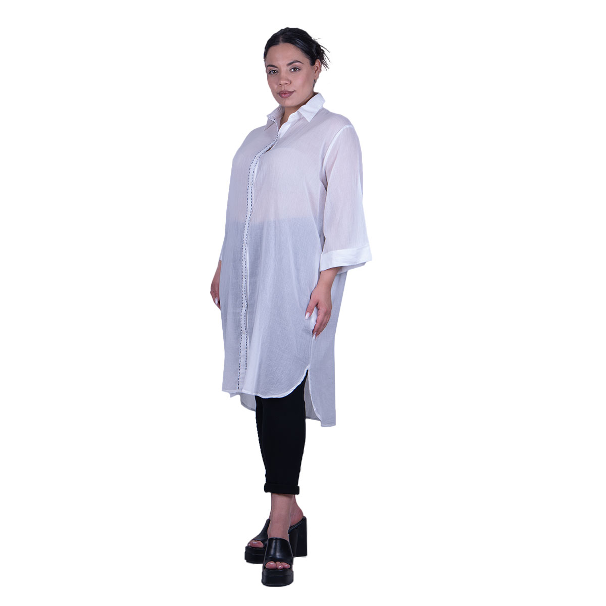 Platinum, αέρινο, καφτάνι – πουκαμίσα λευκή, γυναικείο, με γιακά, πετροπλυμένο, βαμβακερό, κλείνει έως το τελείωμά της με 9 κουμπιά και στα πλαϊνά της έχει μικρά ανοίγματα. Στο πίσω μέρος της κάνει μια μικρή ασυμμετρία.Τα μανίκια του είναι τρουακάρ με ρεβέρ και σε όλο το μήκος των κουμπιών, έχει σχέδιο από έντονο γαζί. Στα πλαϊνά έχει εσωτερικές τσέπες.