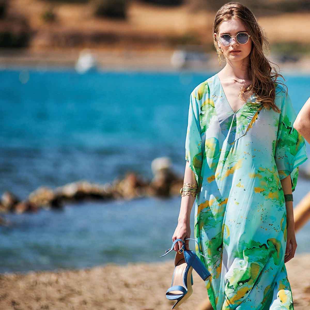 Platinum, νεανικό, καφτάνι – φόρεμα, aqua με πολύχρωμα θαλασσινά σχέδια, γυναικείο, μακρύ, με V ντεκολτέ. Στα τελείωμά του στα πλαϊνά του έχει ανοίγματα. Κολακεύει όλα γυναικεία σώματα!