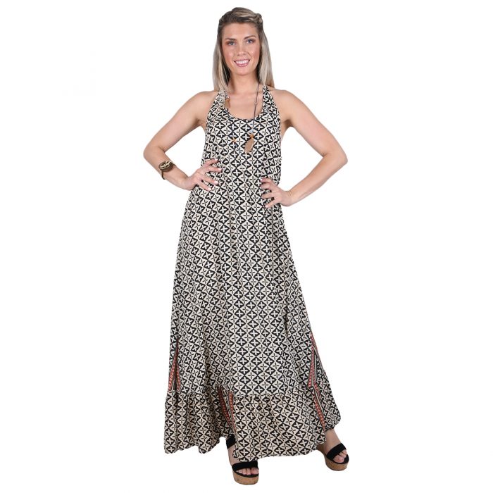 Platinum Φόρεμα Μπεζ Με Μαύρα Σχέδια Γυναικείο Boho Μακρύ Εξώπλατο Μεταξωτό All Day Free Size – 423138-BC