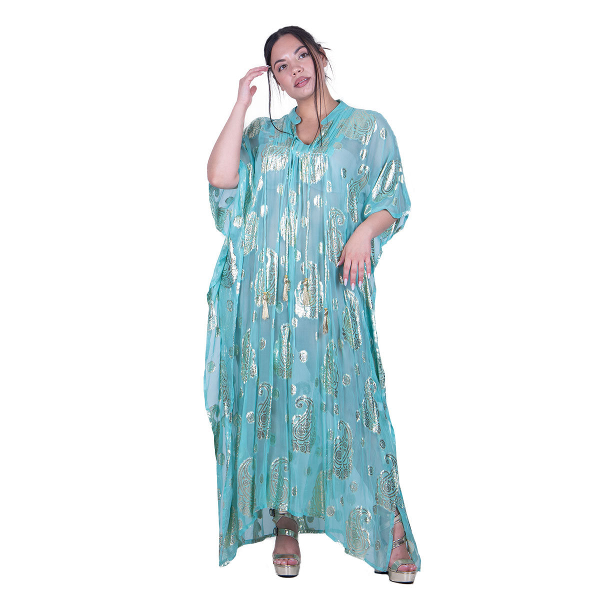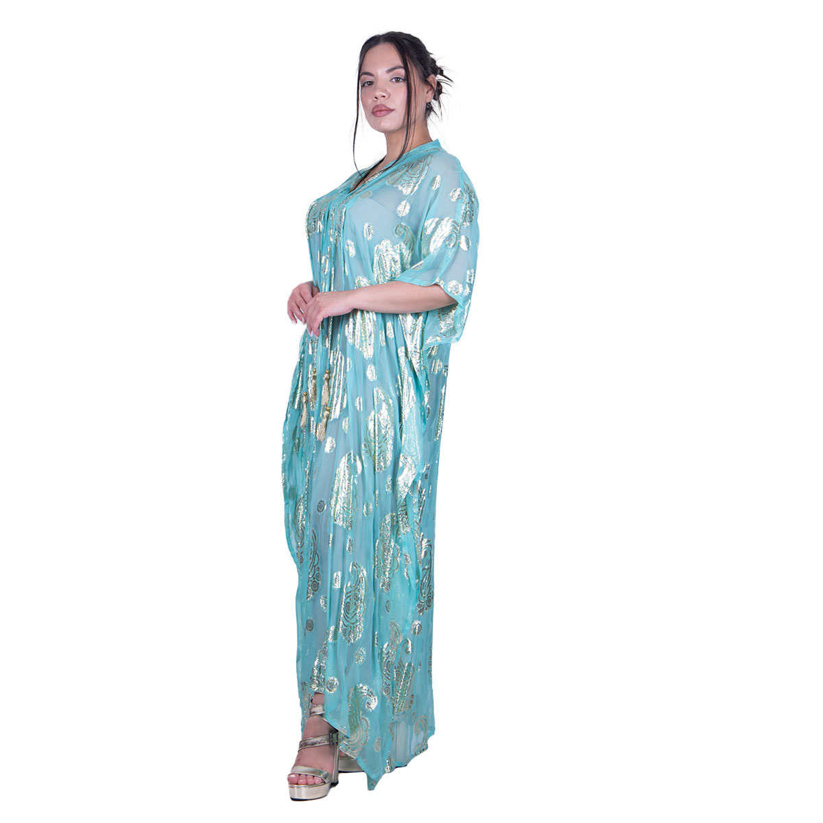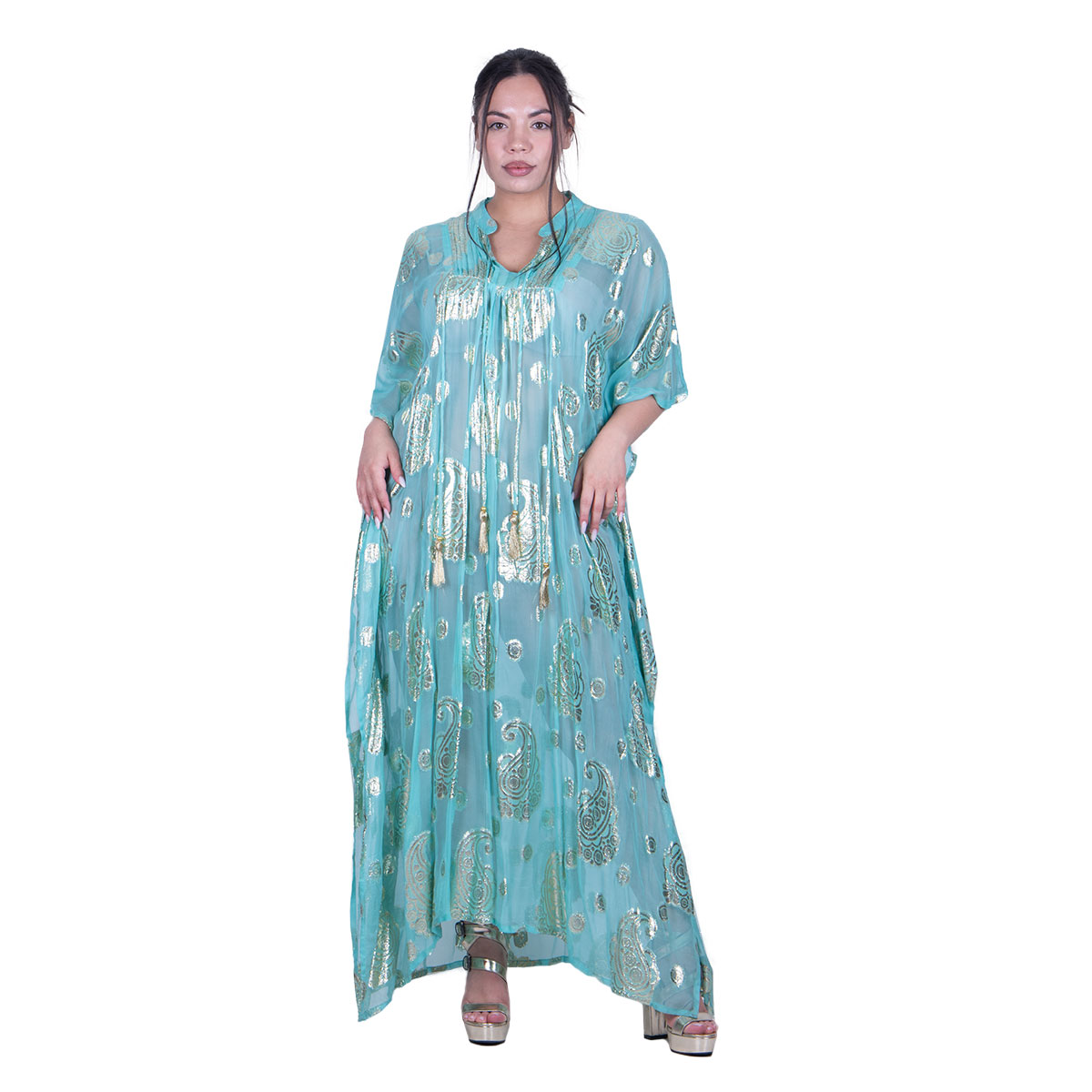 Platinum, υπέροχο, καφτάνι – τουνίκ, aqua – βεραμάν, γυναικείο, maxi, με V ντεκολτέ, κοντό μανίκι και δεσίματα στο μπούστο του, με χρυσά σχέδιο σε διάφορα μεγέθη. Στα τελείωμά του στο πλάι έχει ανοίγματα. Κολακεύει όλα τα γυναικεία σώματα!