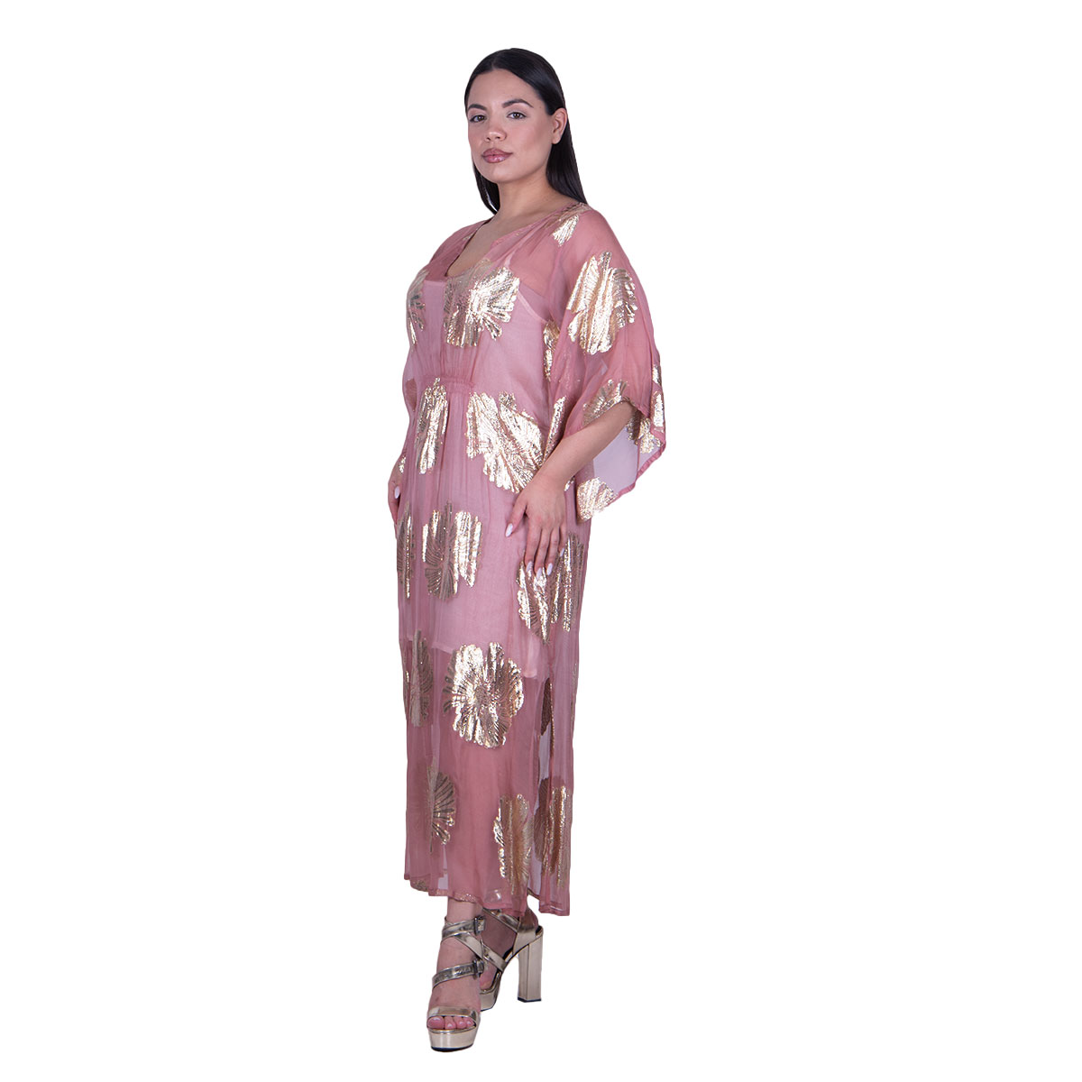 Platinum, νεανικό, καφτάνι – τουνικ, ροζ αντικ, γυναικείο, με V ντεκολτέ, μικρή σφηκοφωλιά κάτω από το στήθος, διάφορα χρυσά σχέδια, μανίκια με μύτες και στα πλαϊνά του έχει ανοίγματα 0.40 cm.