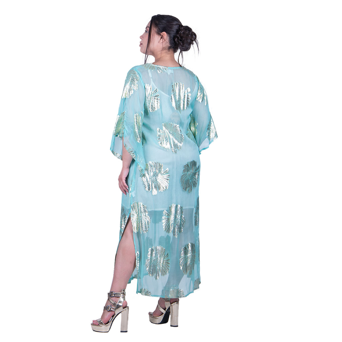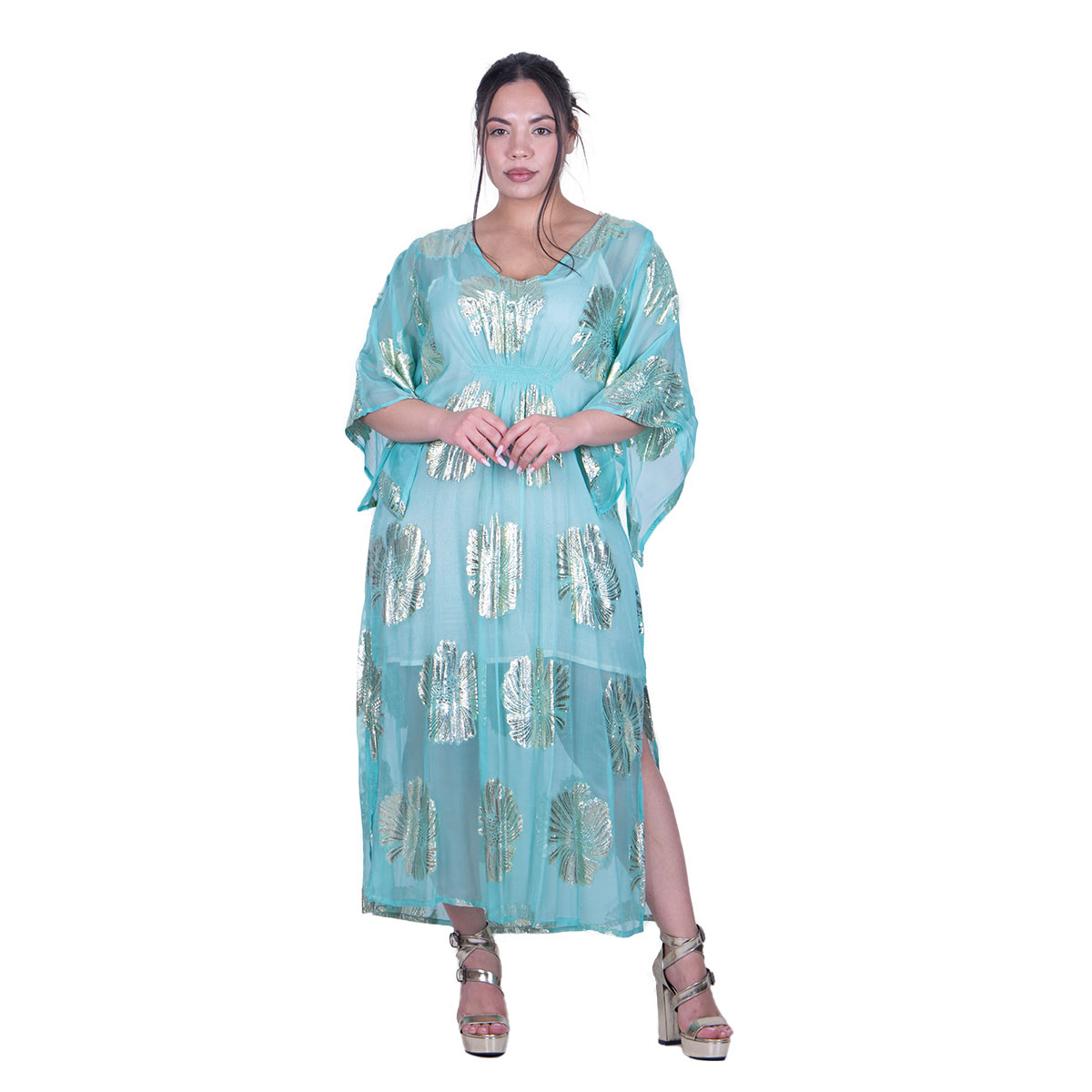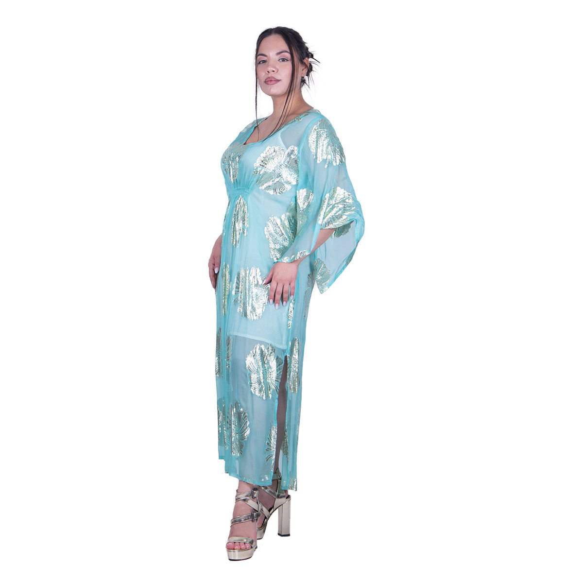 Platinum, νεανικό, aqua – βεραμάν καφτάνι, γυναικείo, με V ντεκολτέ, μικρή σφηκοφωλιά κάτω από το στήθος, διάφορα χρυσά σχέδια, μανίκια με μύτες και στα πλαϊνά του έχει ανοίγματα 0.40 cm.