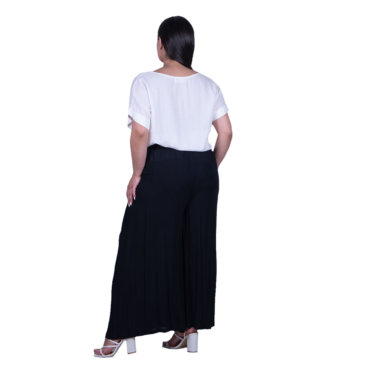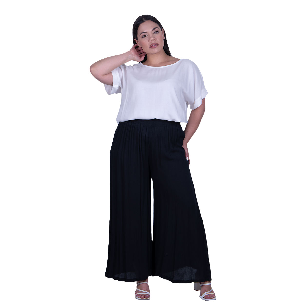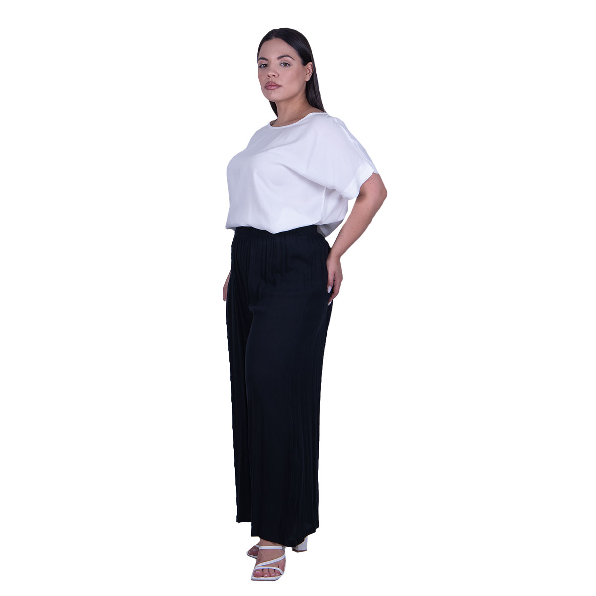 Platinum, νεανική, παντελόνα μαύρη, γυναικεία, καλοκαιρινή, αέρινη, φαρδιά με λάστιχο σφηκοφωλιά στη μέση, ιδανική για το καθημερινό σας ντύσιμο. Άριστης ποιότητας και ιδιαίτερα φιλικό με το δέρμα μας.