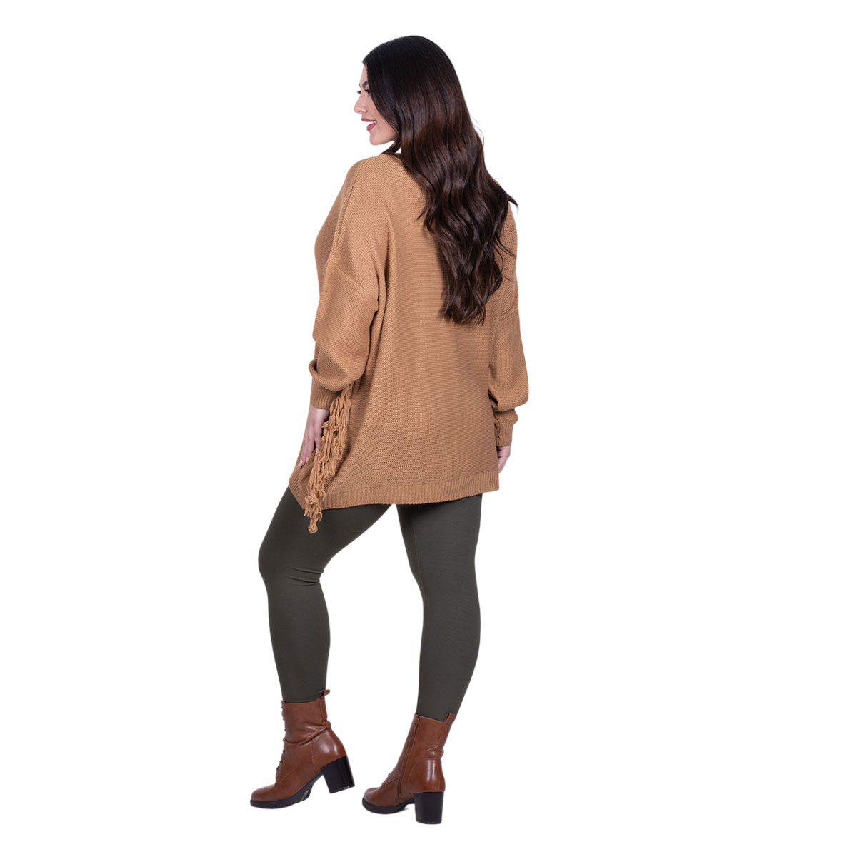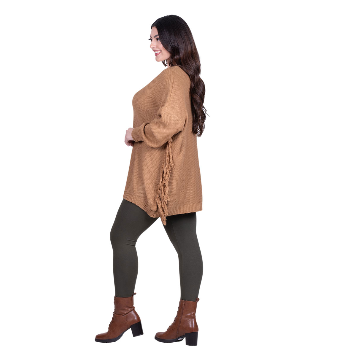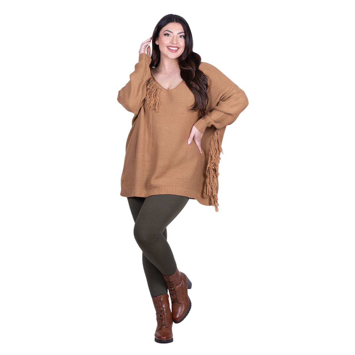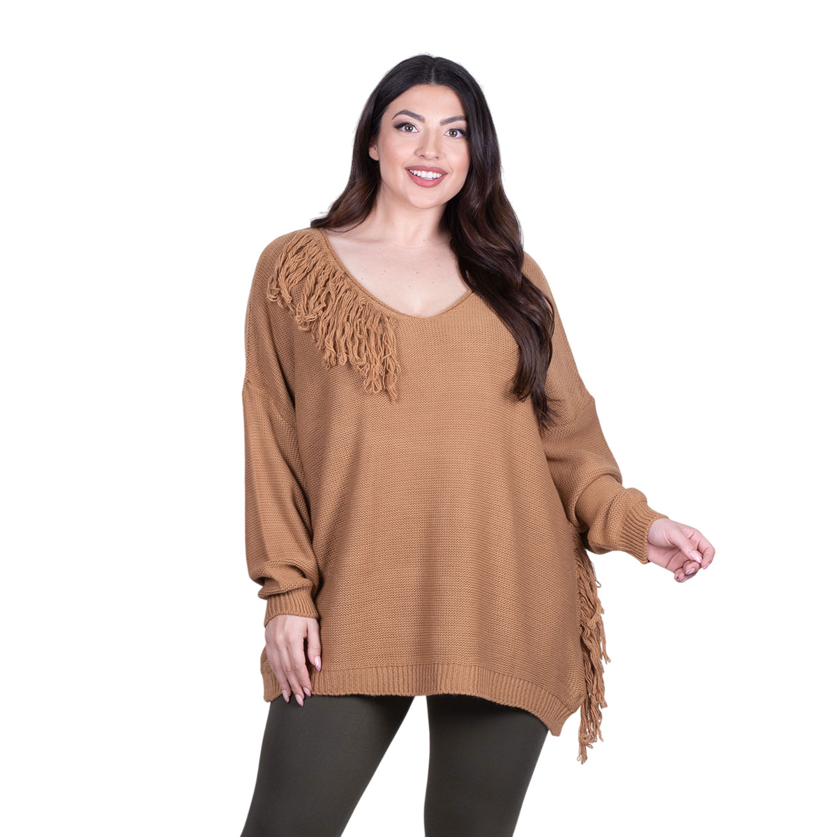 Platinum Μπλούζα Camel Γυναικεία Πλεκτή Μακριά Φαρδιά Με Ντεκολτέ & Κρόσσια Casual Free Size – 24143-CL