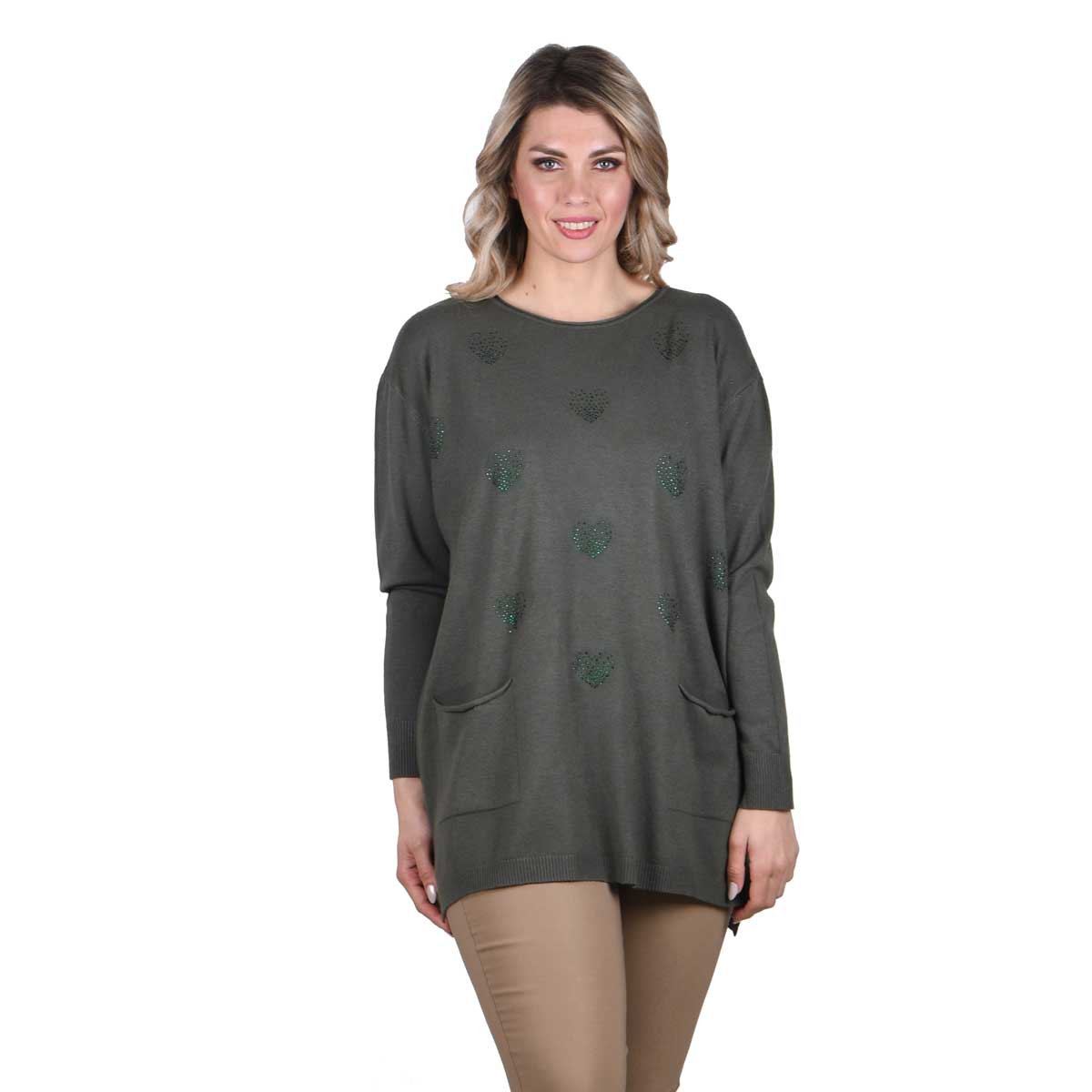 Platinum, χαρούμενη, μπλούζα χακί, γυναικεία, άνετη, από λεπτό πλεκτό βισκόζι, με στρογγυλή οβάλ λαιμόκοψη, δύο μπροστινές τσέπες, μακριά μανίκια, rib άκρες και σχέδιο καρδιές από μικρά strass, μόνο στο μπροστονό της μέρος.