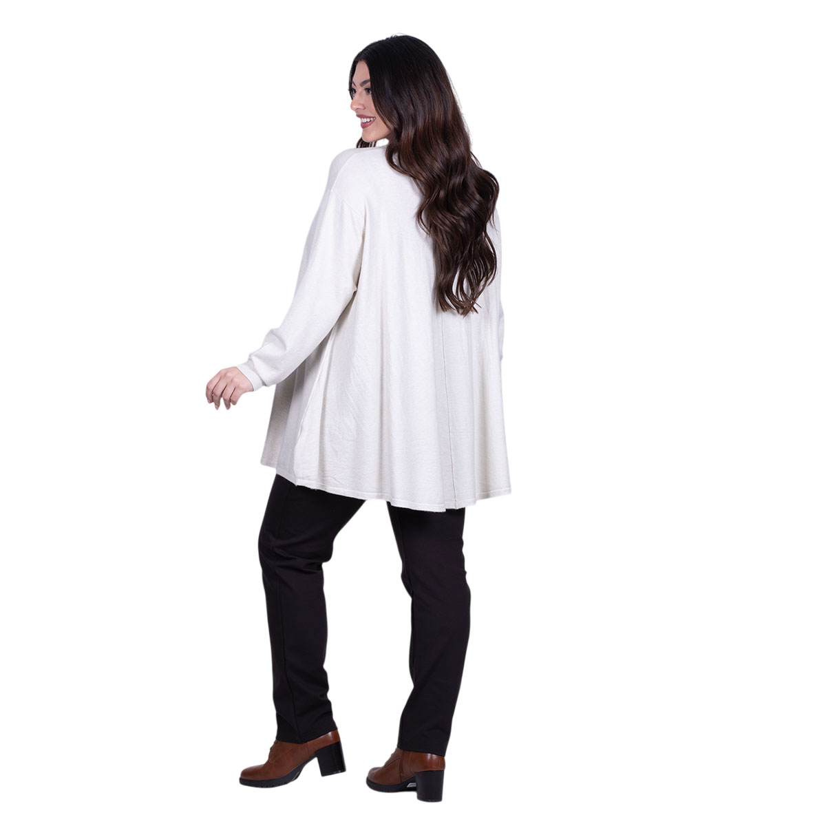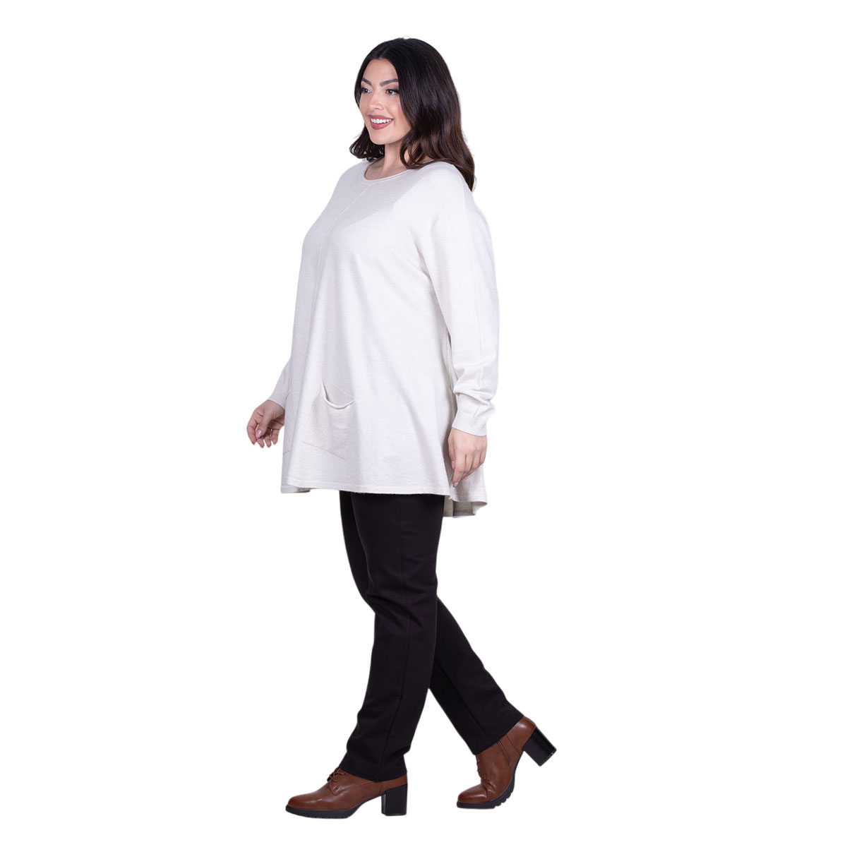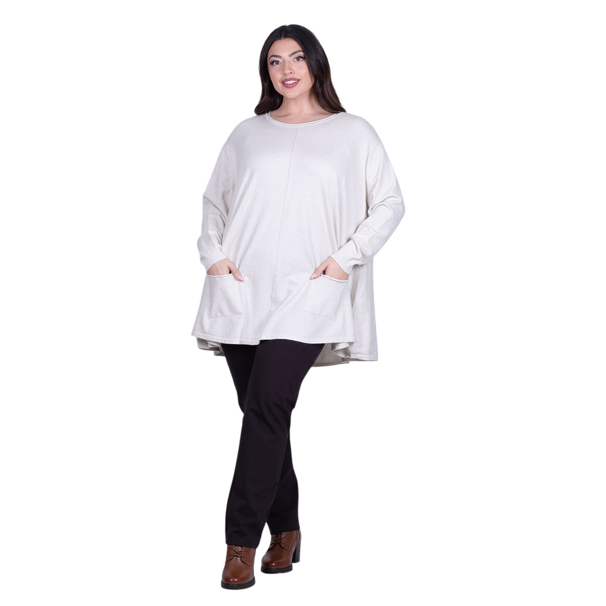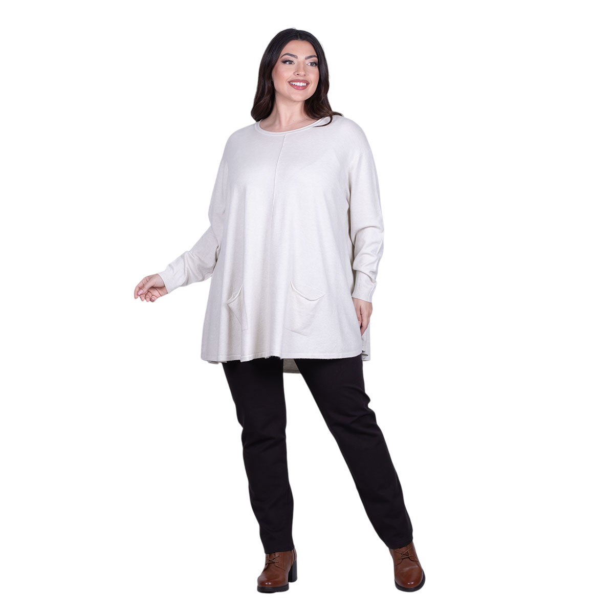 Platinum, καθημερινή, μπλούζα σε εκρού ανοικτό χρώμα, γυναικεία, φαρδιά, μακριά, κλος, με μικρή οβάλ λαιμόκοψη, μακριά μανίκια με rib άκρες και δύο εξωτερικές τσέπες στη μπροστινή της πλευρά.