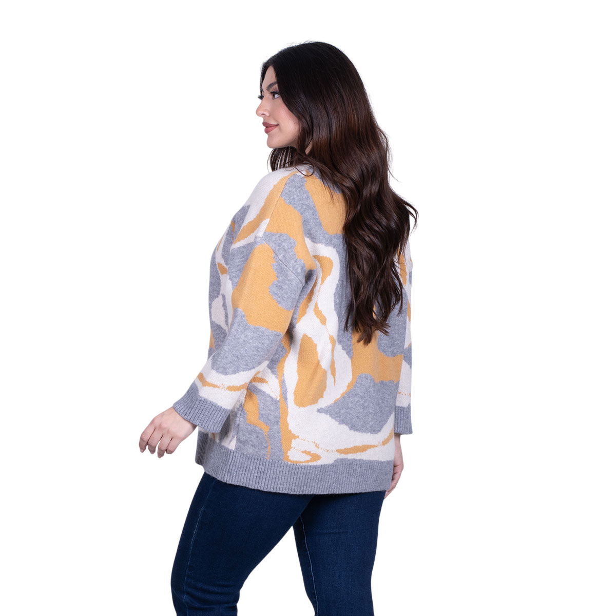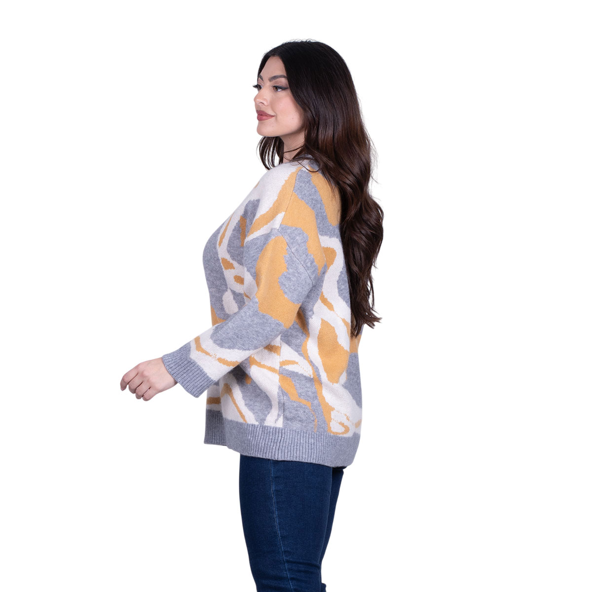 Platinum, καθημερινή, μπλούζα γκρι, με σχέδια σε χρωματισμούς της ώχρας και λευκού χρώματος, γυναικεία, πλεκτή, χειμωνιάτικη, casual, με πλεκτή μανσέτα λάστιχο. Στο τελείωμά της, επίσης έχει λεπτό ριπ λάστιχο. Το πίσω μέρος της έχει ακριβώς τους ίδιους χρωματισμούς. Φοριέται όλη τη διάρκεια της ημέρας. Πολύ φιλικό με το σώμα σας !!!