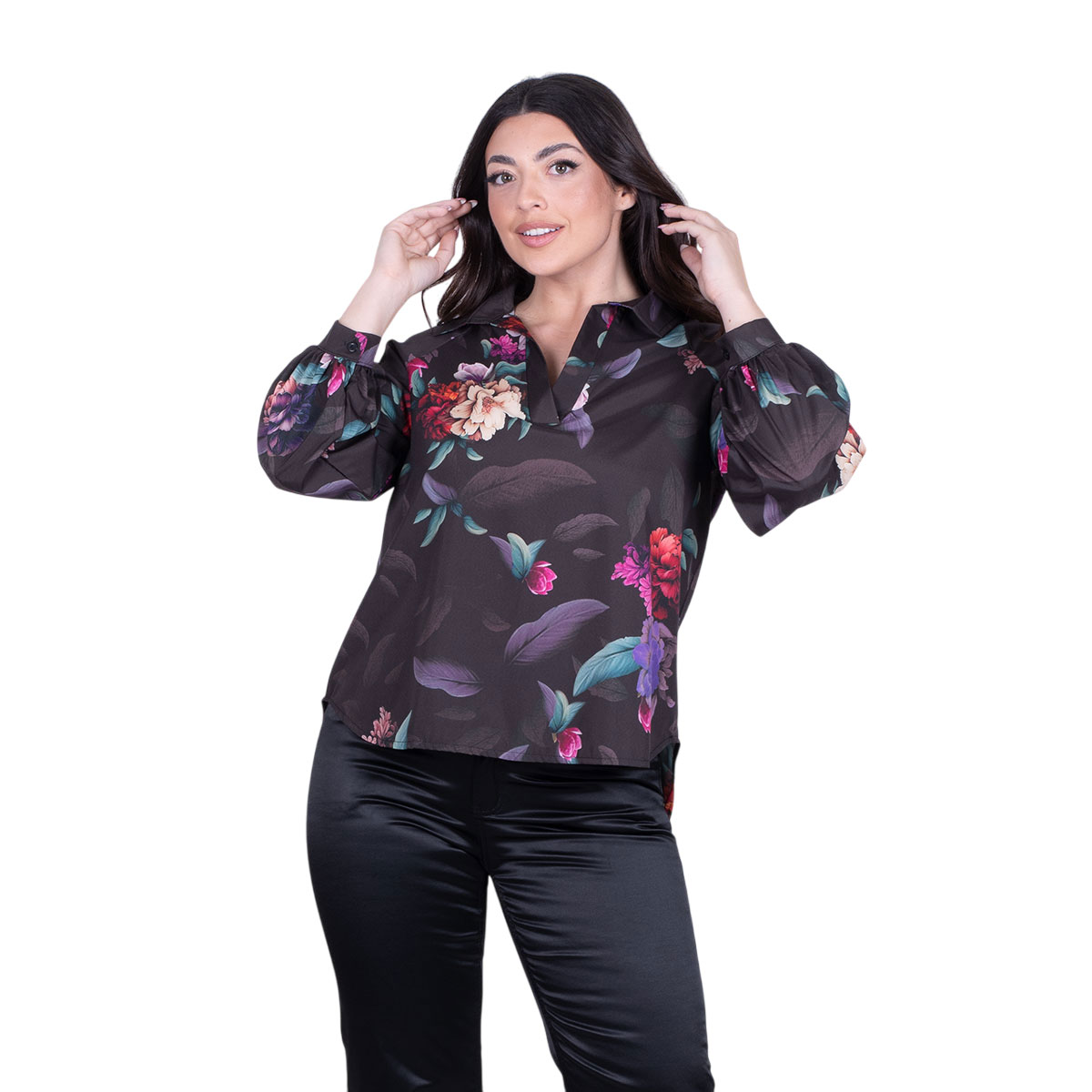 Platinum, νεανικό, πουκάμισα – μπλούζα, μαύρη με χρωματιστά floral σχέδια, γυναικεία, καθημερινή, με γιακά, μακρυμάνικη με μανίκα ρεγκλάν, με στενή μανσέτα με κουμπί και V ντεκολτέ. Στο πίσω μέρος της κάνει μια μικρή ασυμμετρία, μάκρους 8 εκατοστών. Ένα καλοδιαλεγμένο ρούχο, που μπορεί να φορεθεί ως casual με τζιν μέχρι και με κομψά business παντελόνια. Όμορφο σχέδιο!