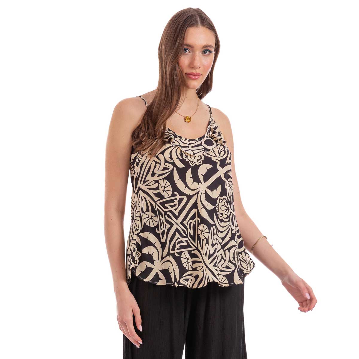 Platinum, νεανική, μπλούζα μαύρη με εκρού boho σχέδιο, γυναικεία, αυξομειωμένες τιράντες και μικρό βολανάκι κάτω από το στήθος. Φοριέται όλη τη διάρκεια της ημέρας. Ιδιαίτερα δροσερή και φιλική με το δέρμα σας.