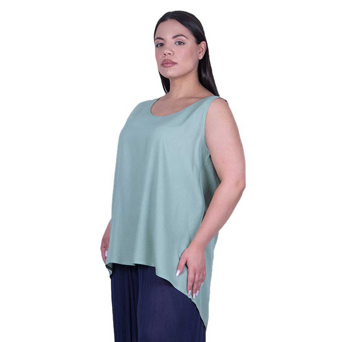 Platinum, άνετη, μπλούζα στο χρώμα της μέντας, γυναικεία, φαρδιά, μακριά, ασύμμετρη, αμάνικη και εβαζέ. Φοριέται όλη τη διάρκεια της ημέρας. Ιδιαίτερα δροσερό και φιλικό με το δέρμα σας.