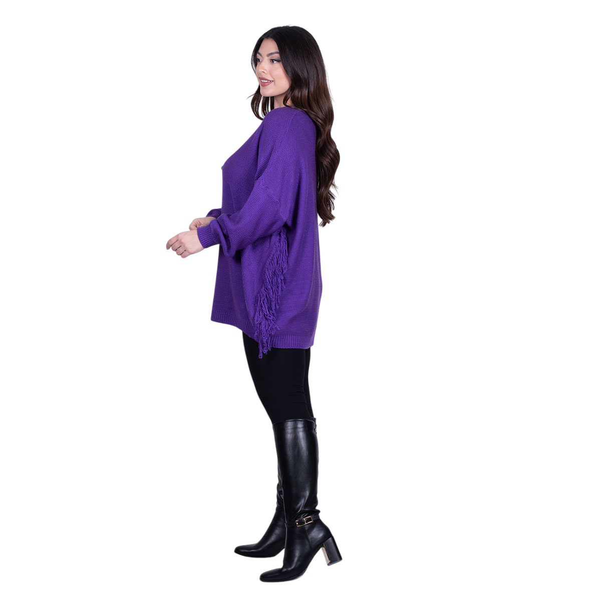Platinum, εντυπωσιακή, μπλούζα μωβ, γυναικεία, νεανική, μακριά, με V ντεκολτέ, casual, από λεπτό πλεκτό, με χαμηλή μανικοκόλληση, σε άνετη γραμμή! Στα τελειώματα της, έχει ριπ πλέξη. Στο ντεκολτέ έχει σχέδιο με κρόσσια, όπως και στη αριστερή του πλευρά.
