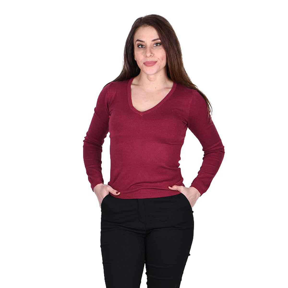 Platinum, καθημερινή, μπλούζα μπορντό, γυναικεία, χειμωνιάτικη, top, νεανική, casual, ελαστική, μακριά μανίκια και V ντεκολτέ. Αγκαλιάζει το σώμα και έχει rib άκρες.
