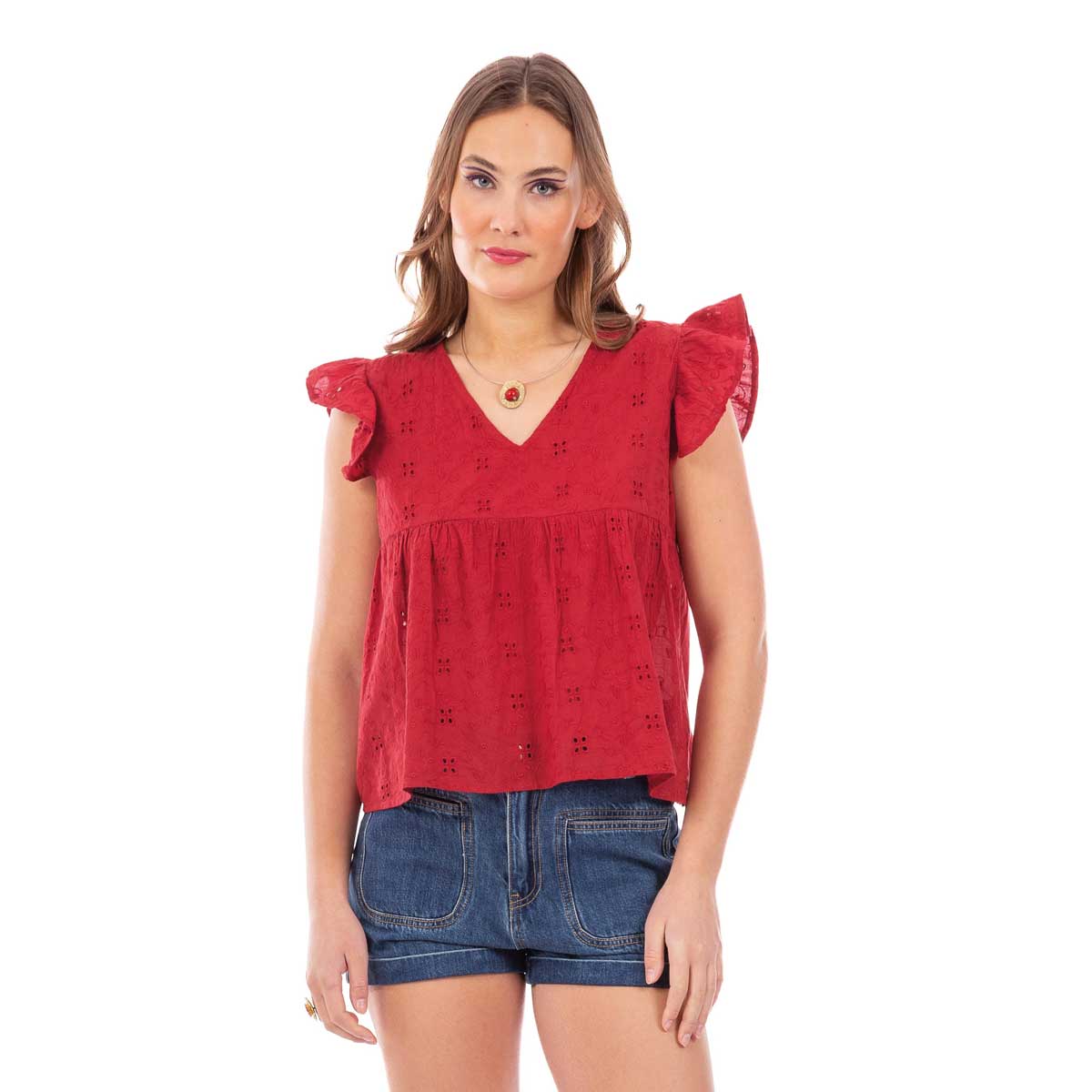 Platinum, νεανική, μπλούζα μπορντοκόκκινη, γυναικεία, καλοκαιρινή, αμάνικη, ampir, κιπούρ, με στρογγυλή λαιμόκοψη, V ντεκολτέ και μικρό μανικάκι βολάν. Φοριέται όλη τη διάρκεια της ημέρας. Ιδιαίτερα δροσερή και φιλική με το δέρμα σας.