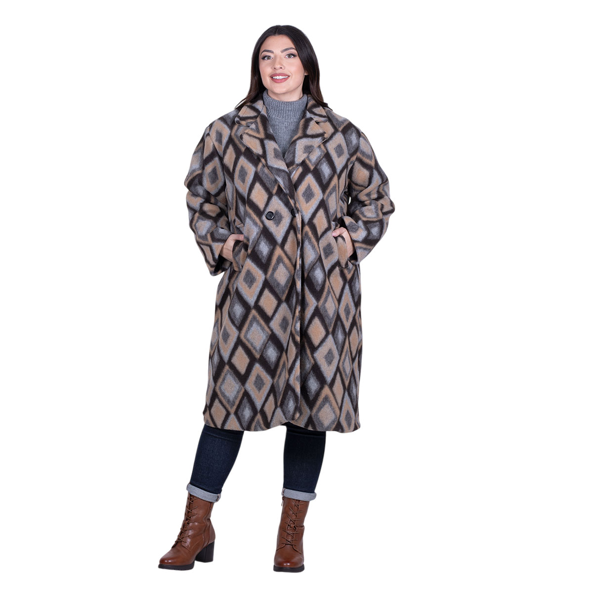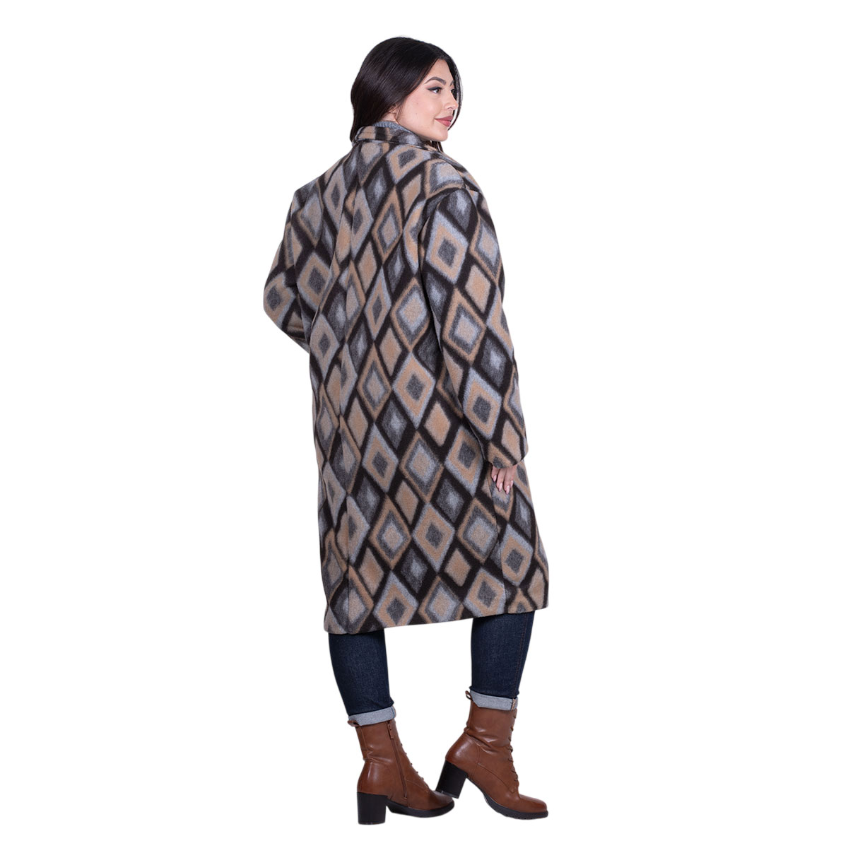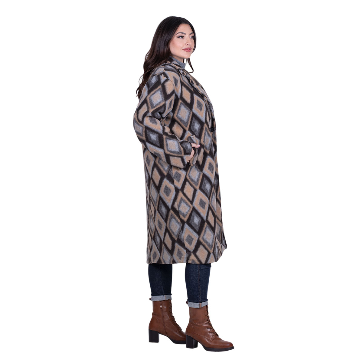 Platinum, νεανικό, παλτό καφέ με καμηλό και σχέδιο με ρόμβους σε χρωματισμούς του γκρι και του γαλάζιου, γυναικείο, και γιακά με διπλό πέτο. Στο μπροστινό του μέρος, έχει τσέπες και κουμπώνει με κουμπί.